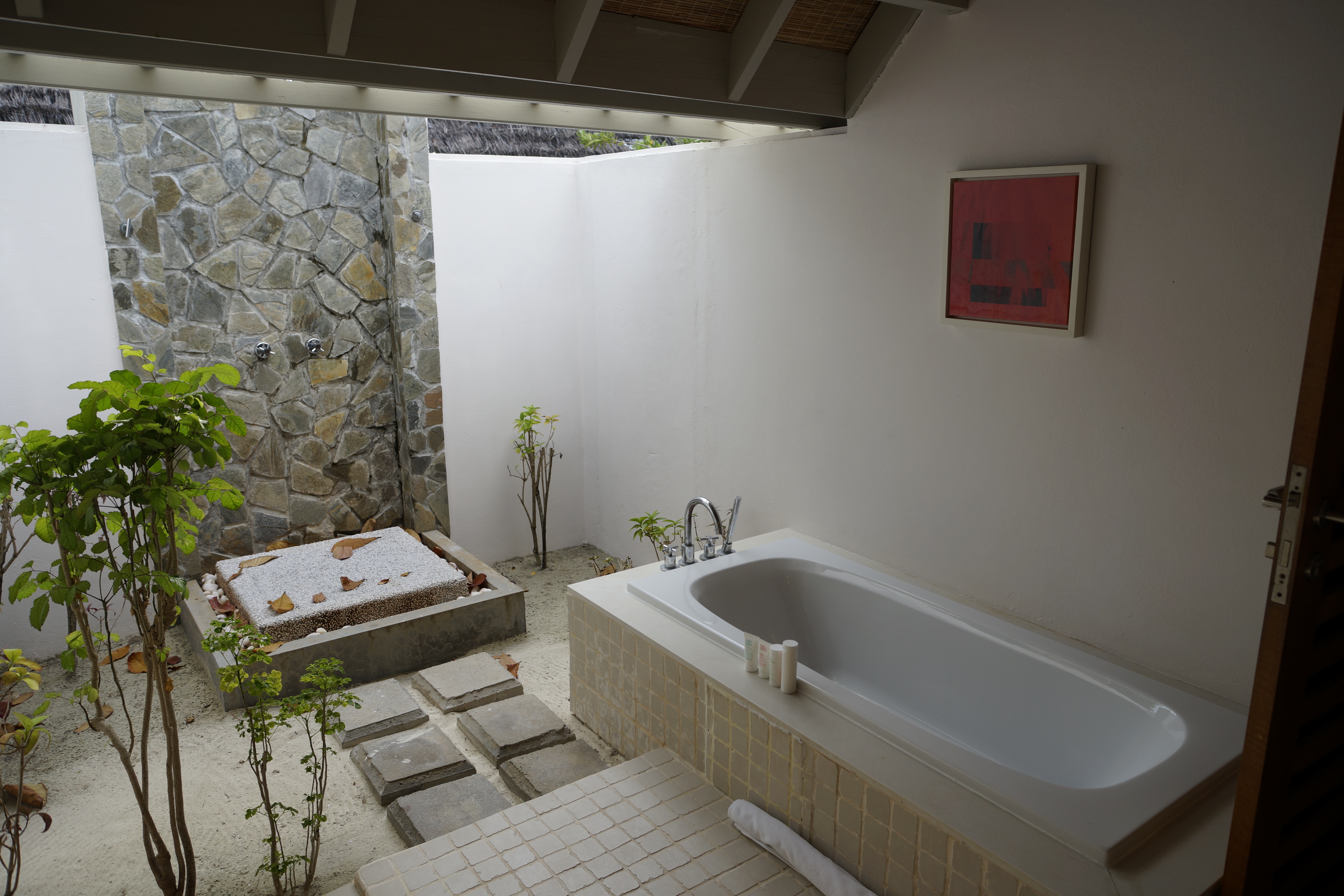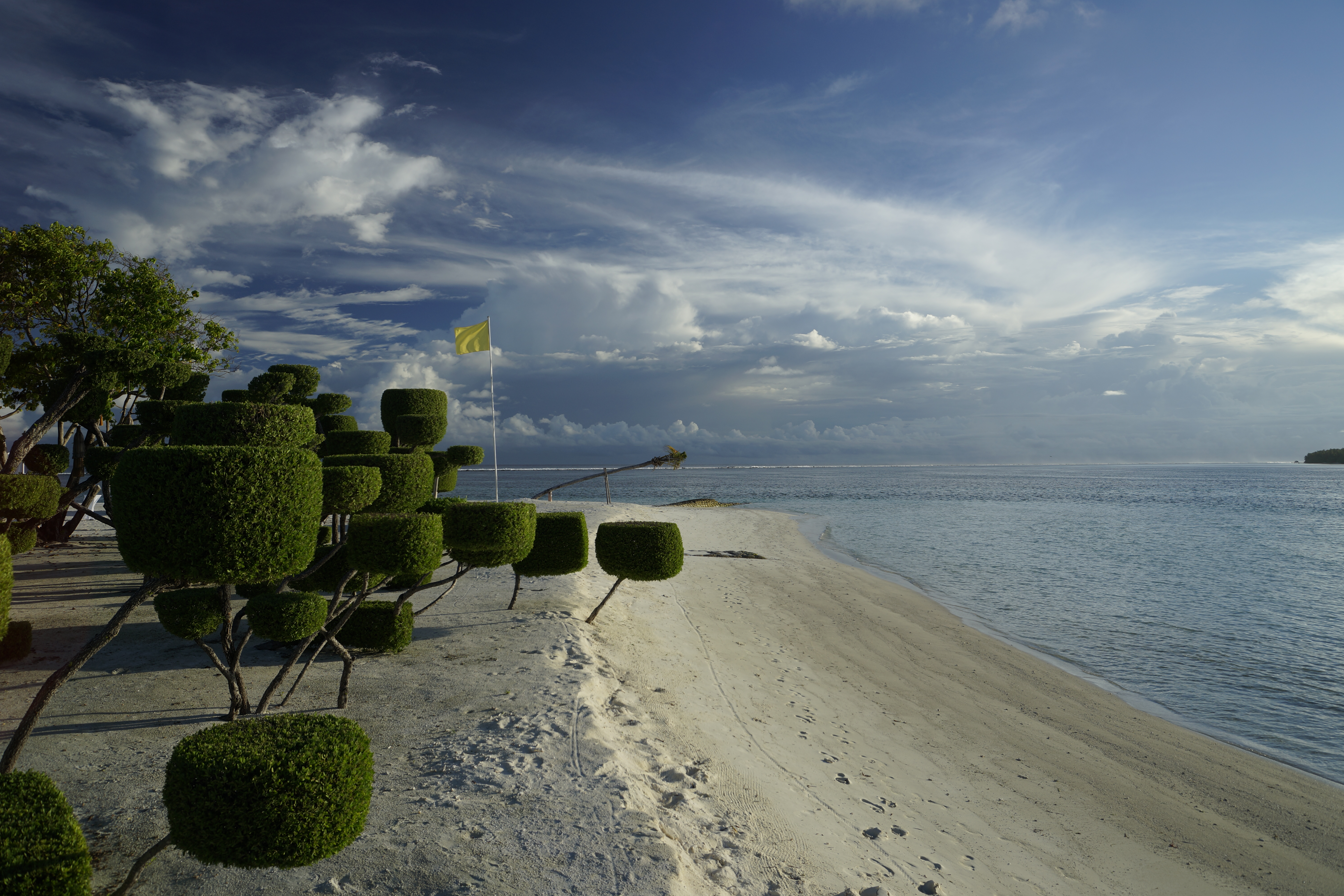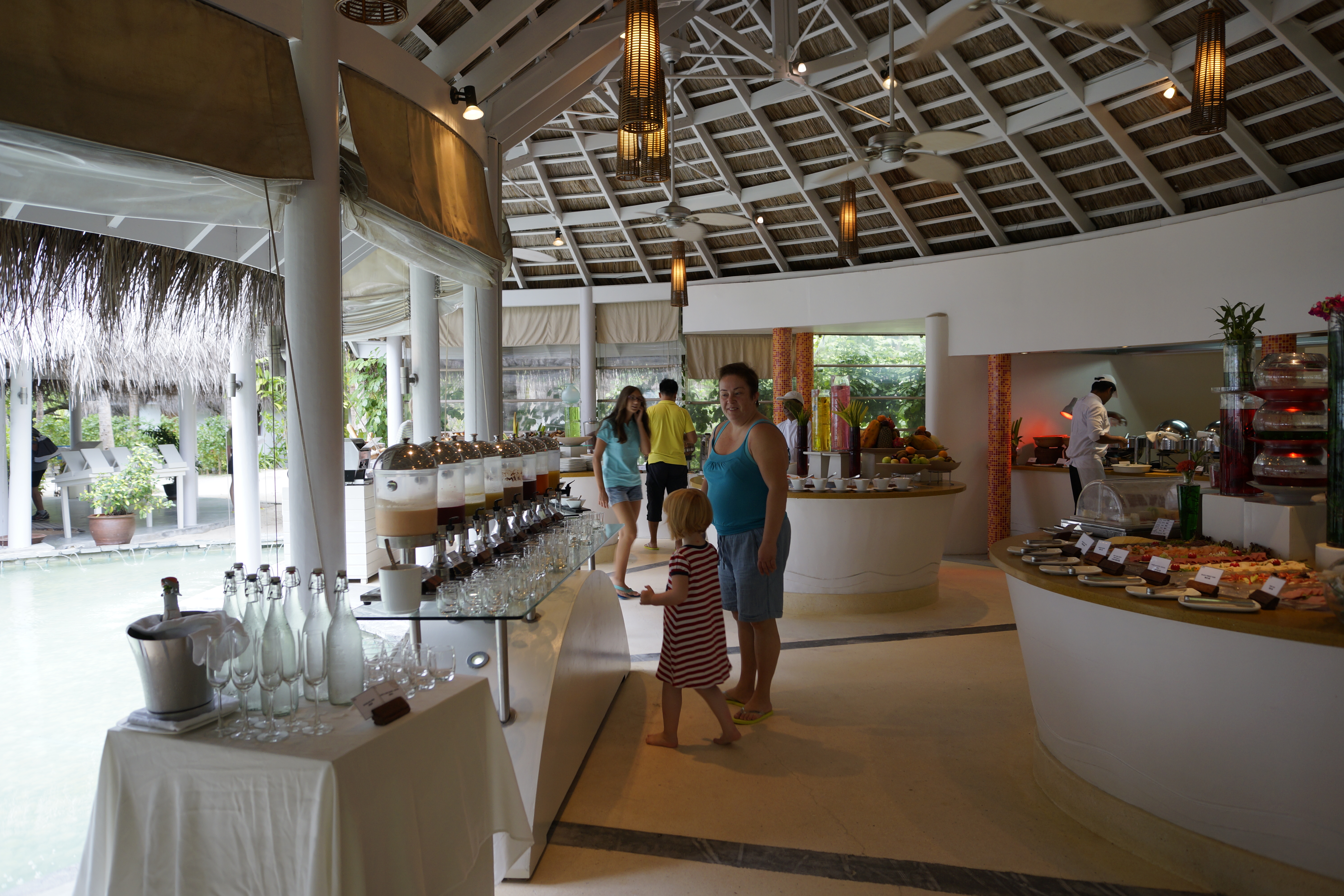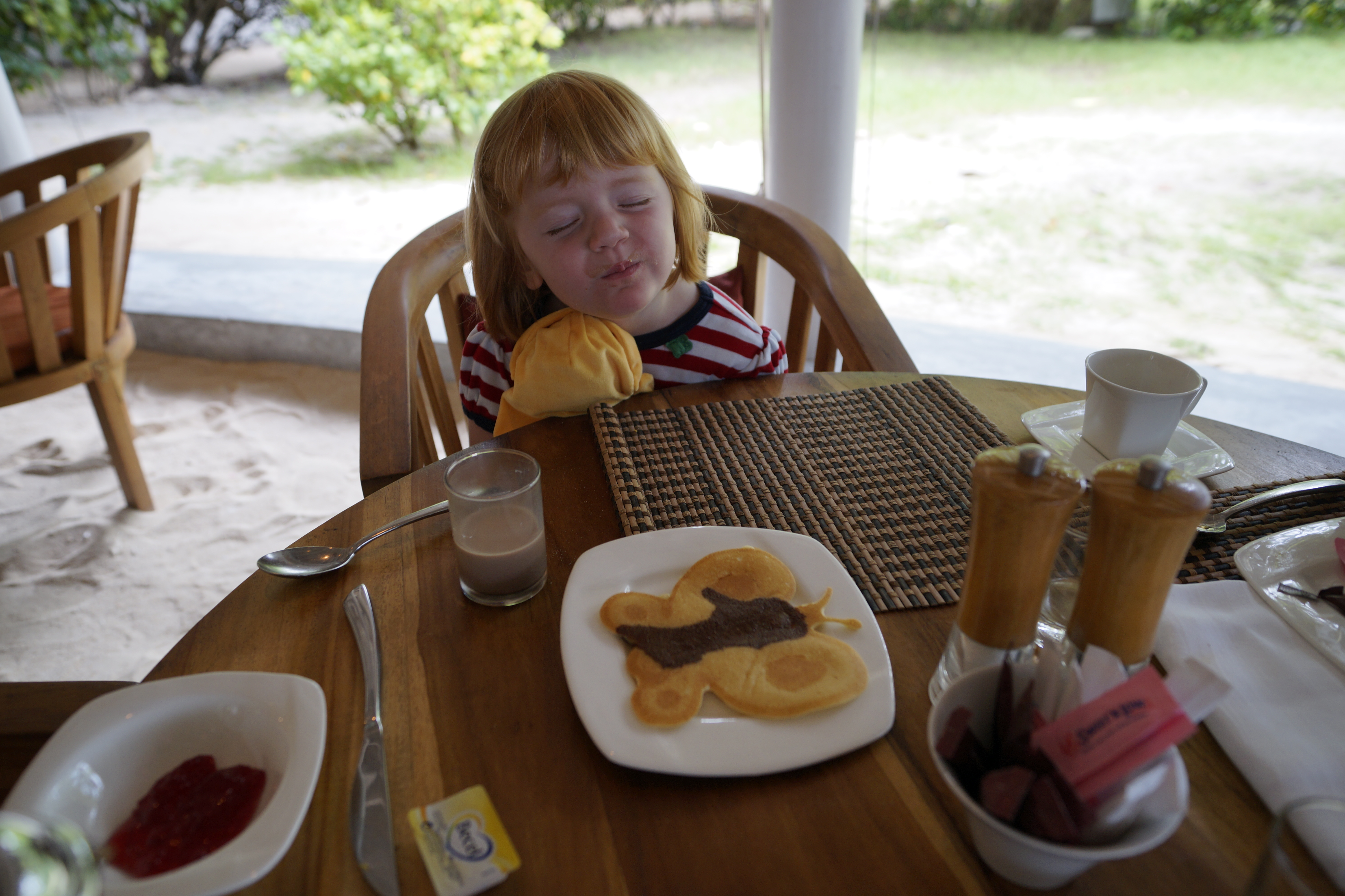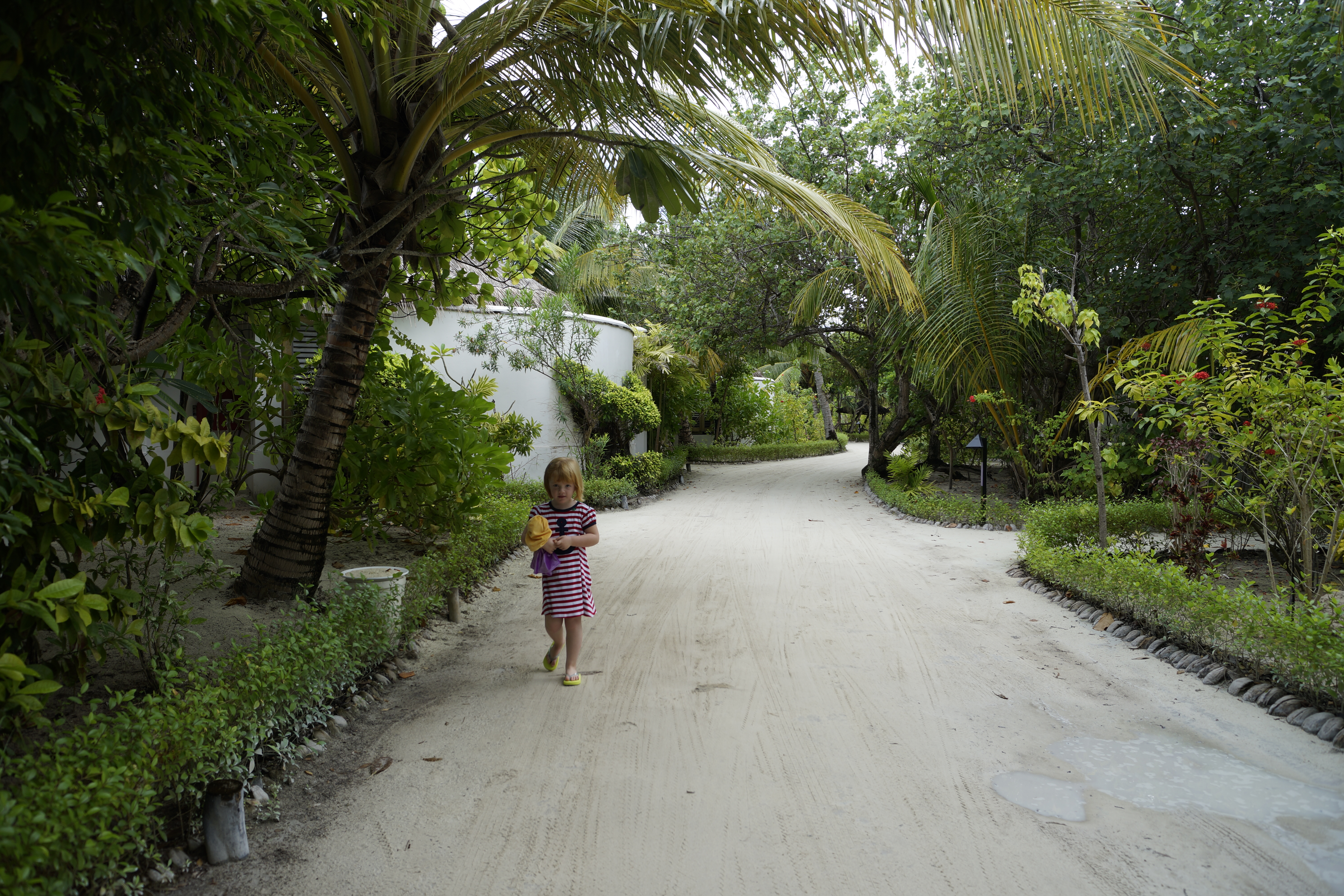 Det er flere restauranter på hotellet og vi må gå et lite stykke på veier av sand mellom trærne for å komme dit de har frokost.