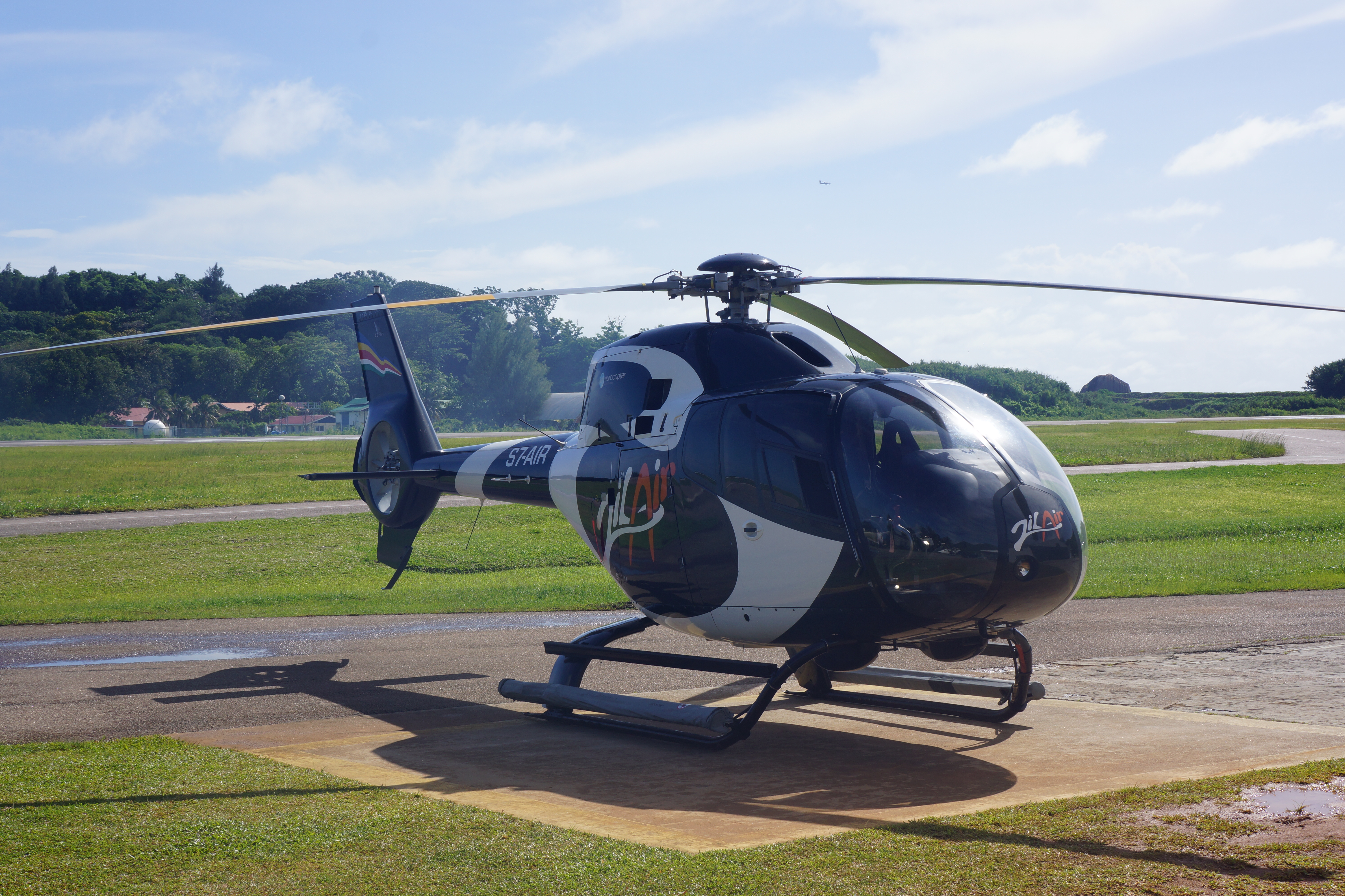 Egentlig skulle vi nå ventet på nytt fly videre til naboøya Praslin, tatt buss til en havn, og kjørt båt over til øya der vi skal bo de første dagene, La Digue. Vi fant ut hjemme at dette kunne ta lang tid, og siden turen allerede hadde vært lang så bestilte vi helikopter den siste etappen isteden.