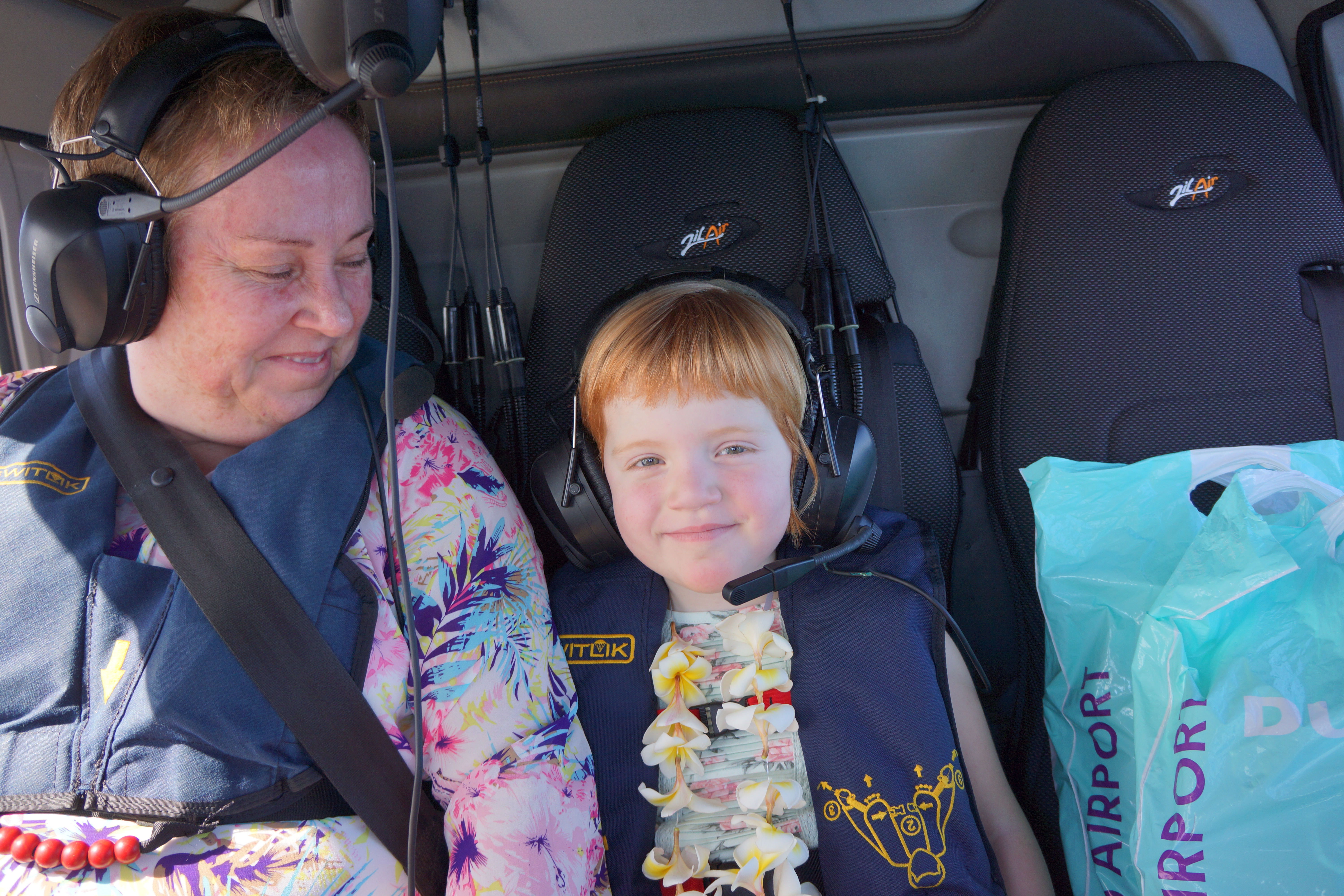 Helikopter var fantastiskt! Det lettet rett opp og suste utover rullebanen og havet. Ombord var det veldig mye bråk og vi måtte ha på hodetelefoner med mikrofoner for å kunne snakke sammen og med piloten. Piloten var forøvrig fra Sverige og dagen etter skulle det komme en ny pilot fra Norge. Helikopterturen ristet også ganske mye, men det var aldri skummelt. Pappa satt sammen med piloten foran, mens jeg og mamma satt i baksetet.