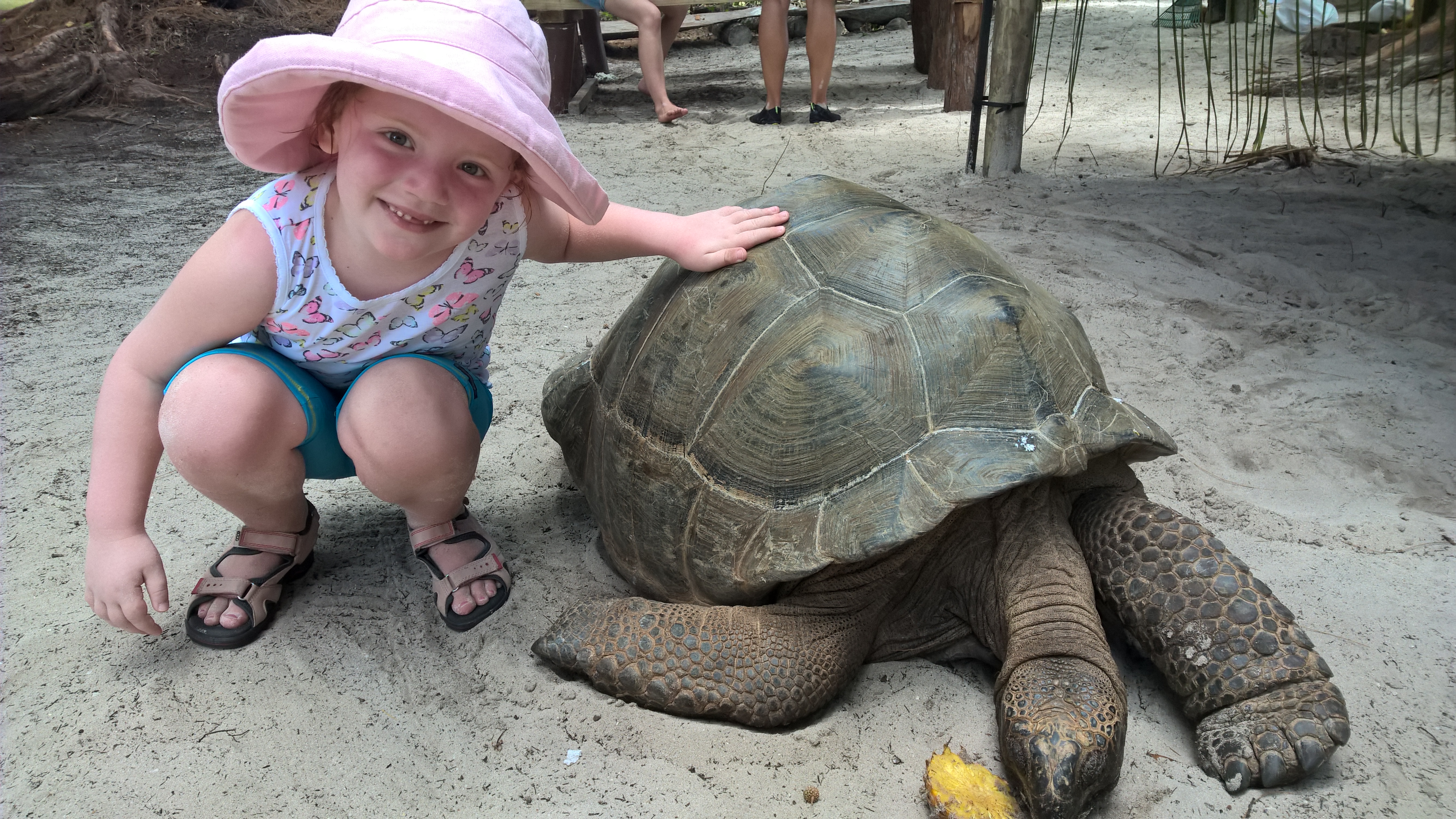 Når jeg ble tørst gikk pappa ned i juice-kiosken og kjøpte en kokosnøtt til meg. I kiosken gikk det skillpadder, store skillpadder. De er ikke farlige, men kan bite og det gjør vondt.