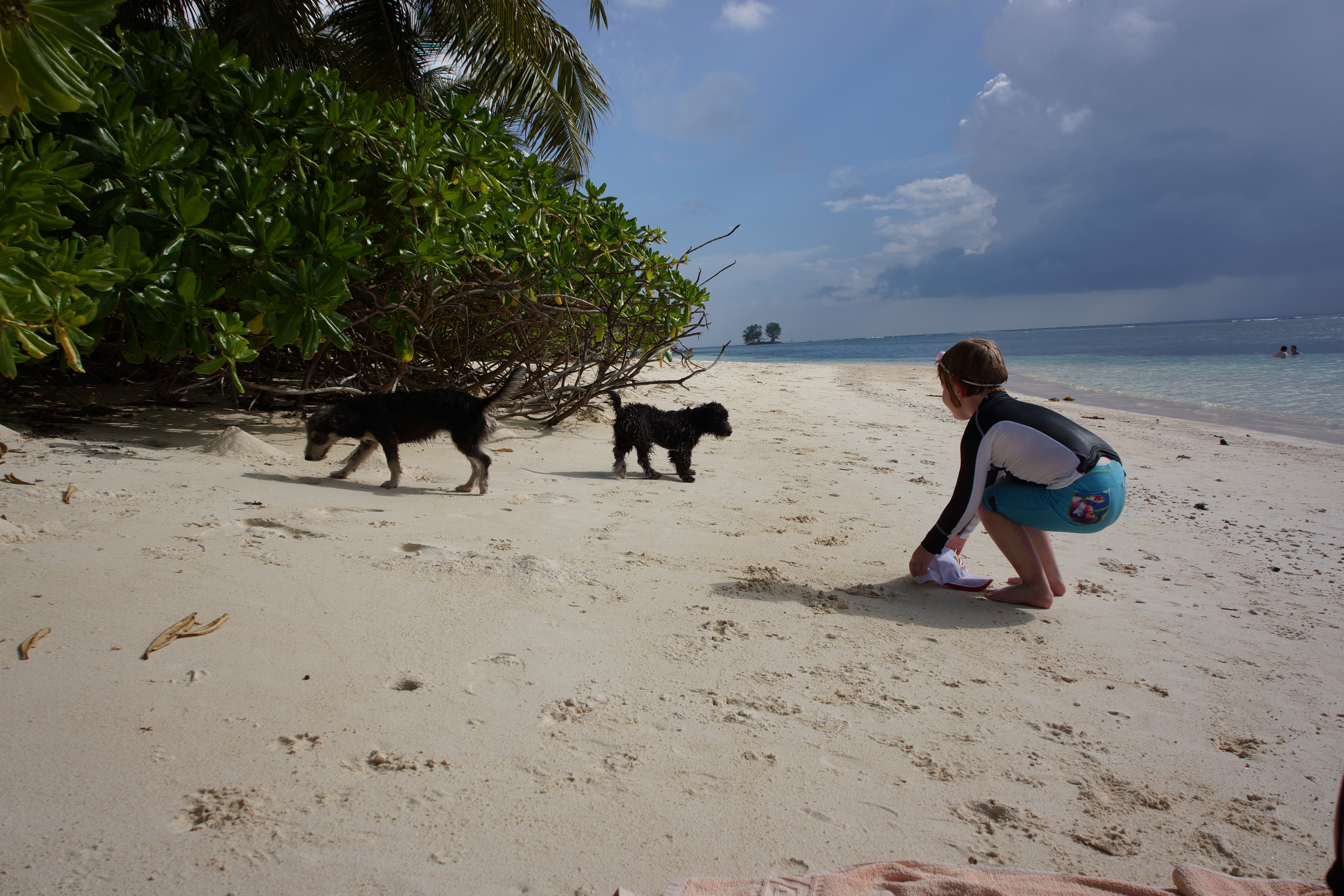 Ettermiddagen tilbrakte vi på stranda rett nedenfor der vi bor. Der hilste vi på et par av hundene som bor på stranden og i nærheten. Dette er løshunder, så selv om de virker bare snille og vil leke, er vi forsiktige slik at de ikke kommer altfor nære – eller stjeler maten vår!