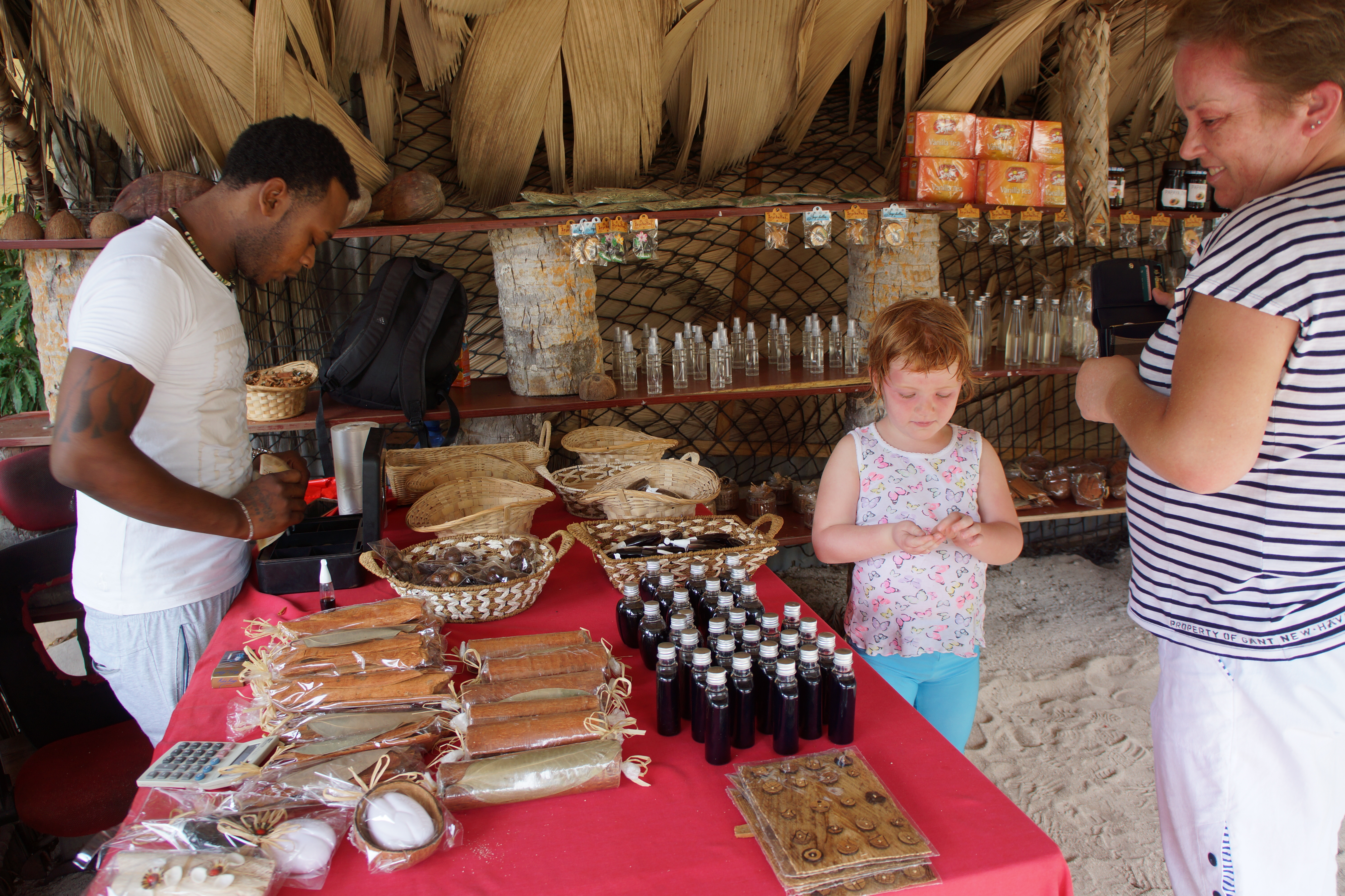 Etter bading dro vi tilbake gjennom plantasjen. Her planter de vanilje. Vanilje er frukter som de kan tørke og lage essens av. Det lukter kjempegodt. Spesielt liker jeg vaniljemelk som vi kjøper i butikken her. Vi kjøpte med oss vanilje og jeg fikk også bark fra kaneltreet. Dette er kanel som vi bruker på grøt i Norge. Lukter også godt.
