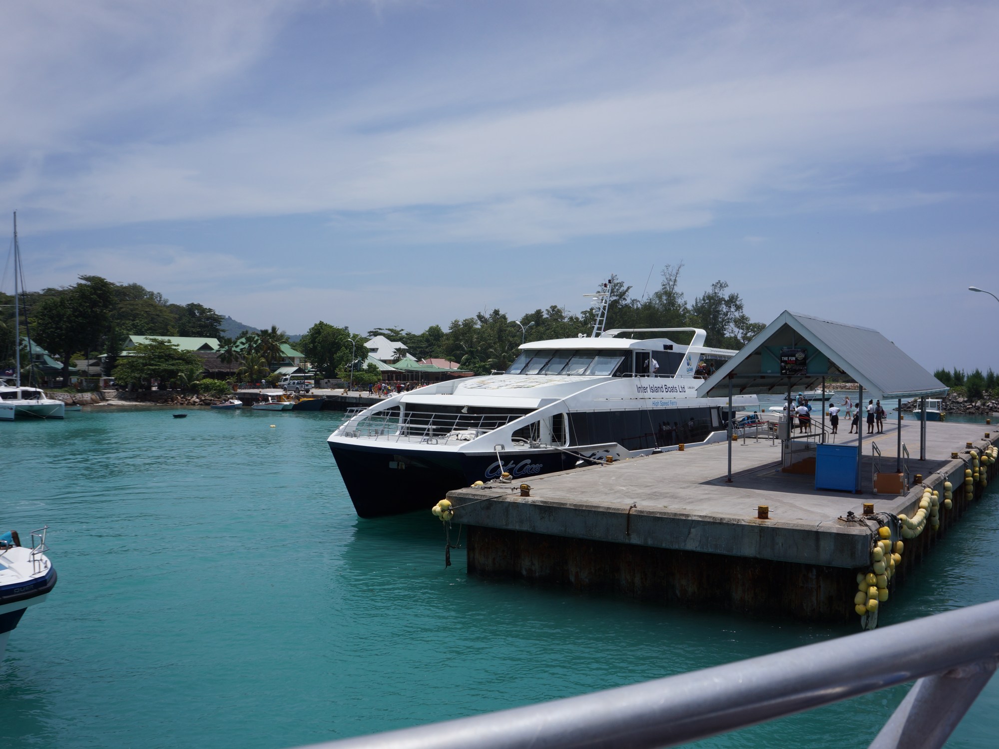 Her kjører vi ut fra kaia på La Digue. Den andre båten skal til Mahé.