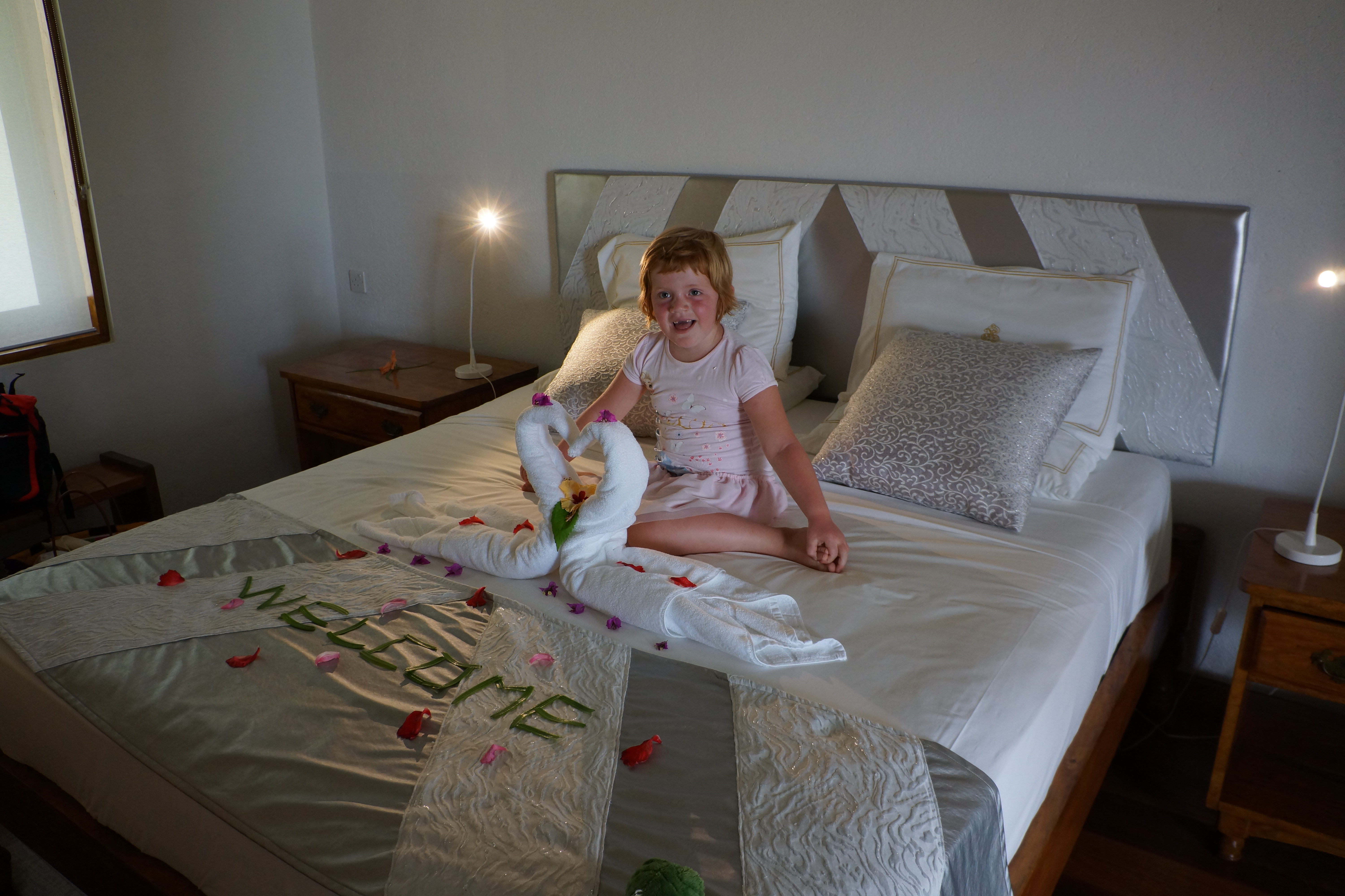 På sengen har de skrevet velkommen og laget hjerte-svaner.