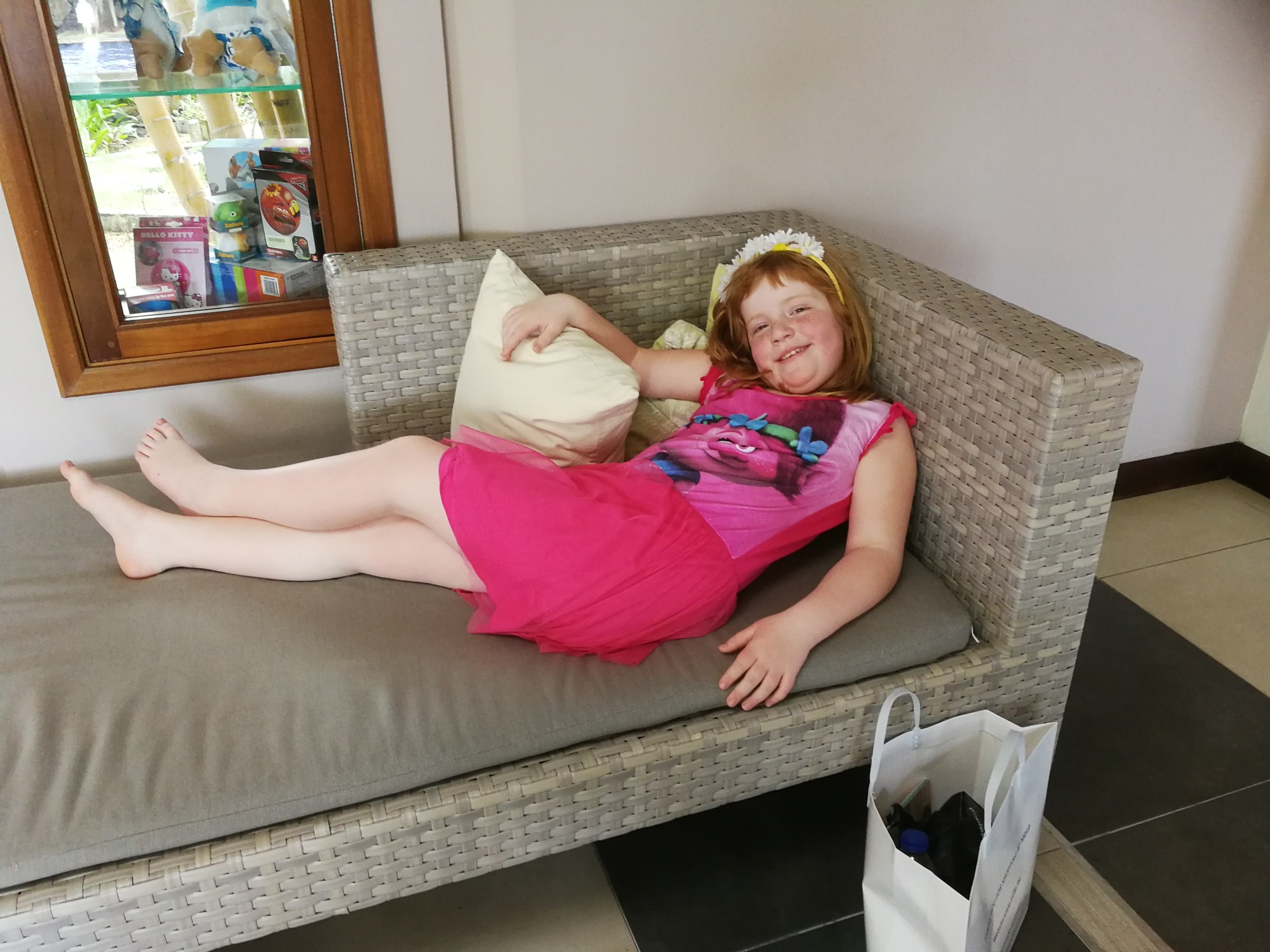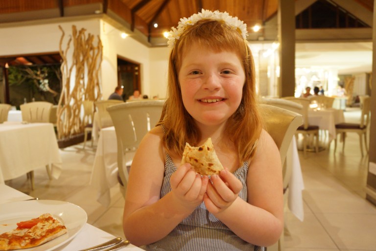 Vel framme på Tamassa fikk jeg endelig ta på badetøy og hoppet i bassenget før det var afternoon pancakes. Det er solg og regn, og veldig varmt og deilig. Litt regn gjør ingenting, for jeg er uansett mer i bassenget enn på land!