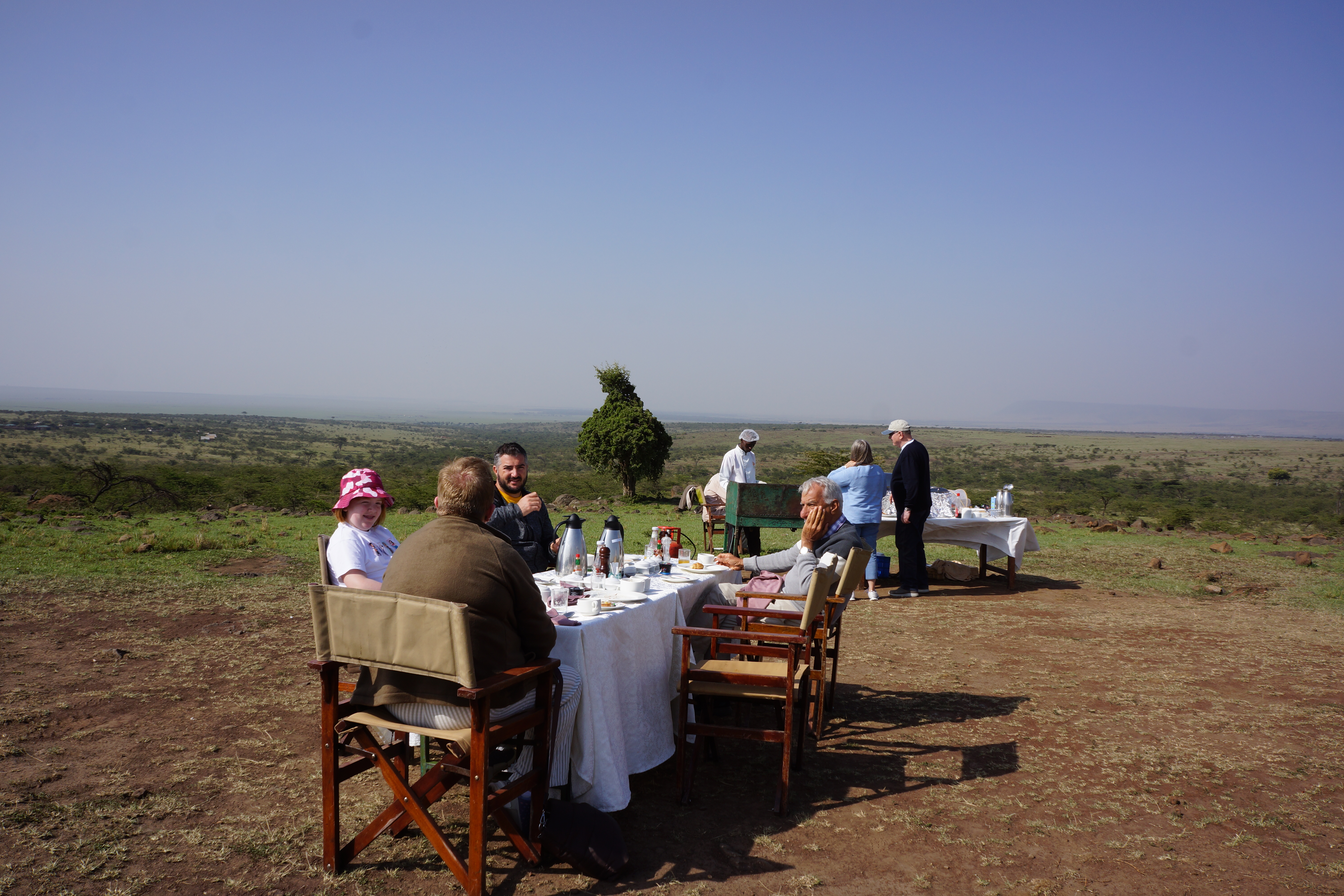 Etter noen flere dyr drar vi til et høydedrag der de har dekket på med frokost til oss. Så i soloppgangen sitter vi og nyter utsikten og snakker med våre nye venner fra Oman. Vi får nystekte omletter og pannekaker, også glutenfrie til mamma. Akkurat nå har jeg ikke lyst til å dra fra Masai Mara…