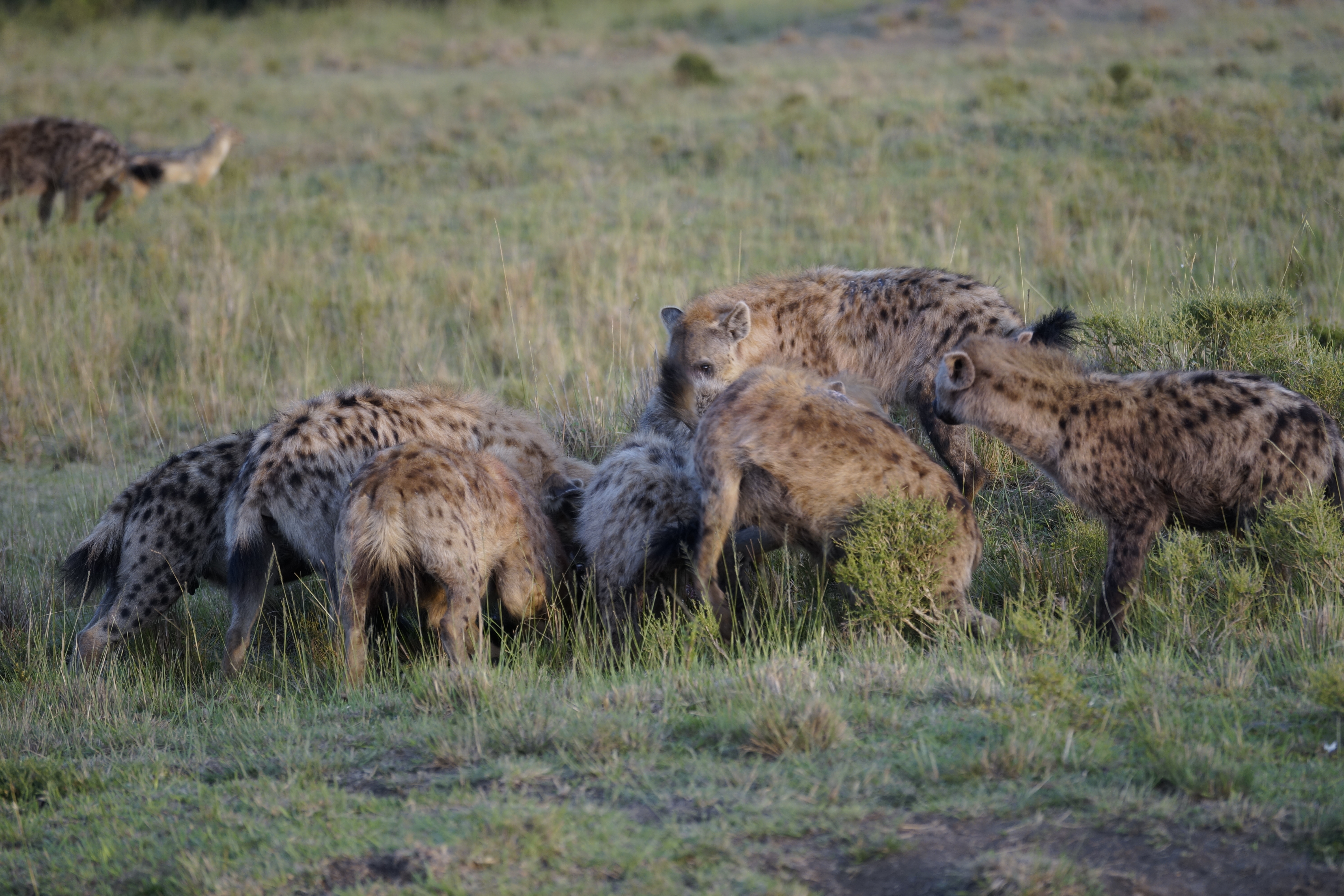 Etterhvert ser vi løvinnen og hun blir fulgt av en flokk hyener. Løven brummer dypt når hun legger seg ned og hyenene lurer seg for tett innpå. Det virker ikke som om hun setter pris på selskapet, men snart mister hyenene interessen og lunter avgårde. Hyenene spiser nesten alt. Dominic forteller at de spiser alt av dyr, også hverandre, og til og med gummistøvler og plast.