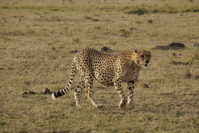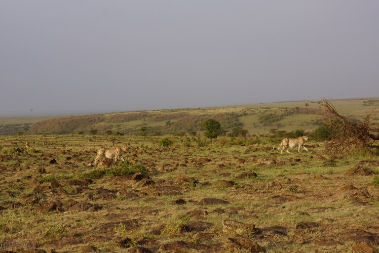 Men, det var mer å se. På veien videre kommer vi over to gepard-brødre som har vært en tur i Serengeti, men nå er tilbake til Masai Mara. Og gjett om de har spist! Disse brødrene jakter sammen og i følge Domenic er de veldig gode jegere. Nå har de spist så mye at de knapt orker å gå.