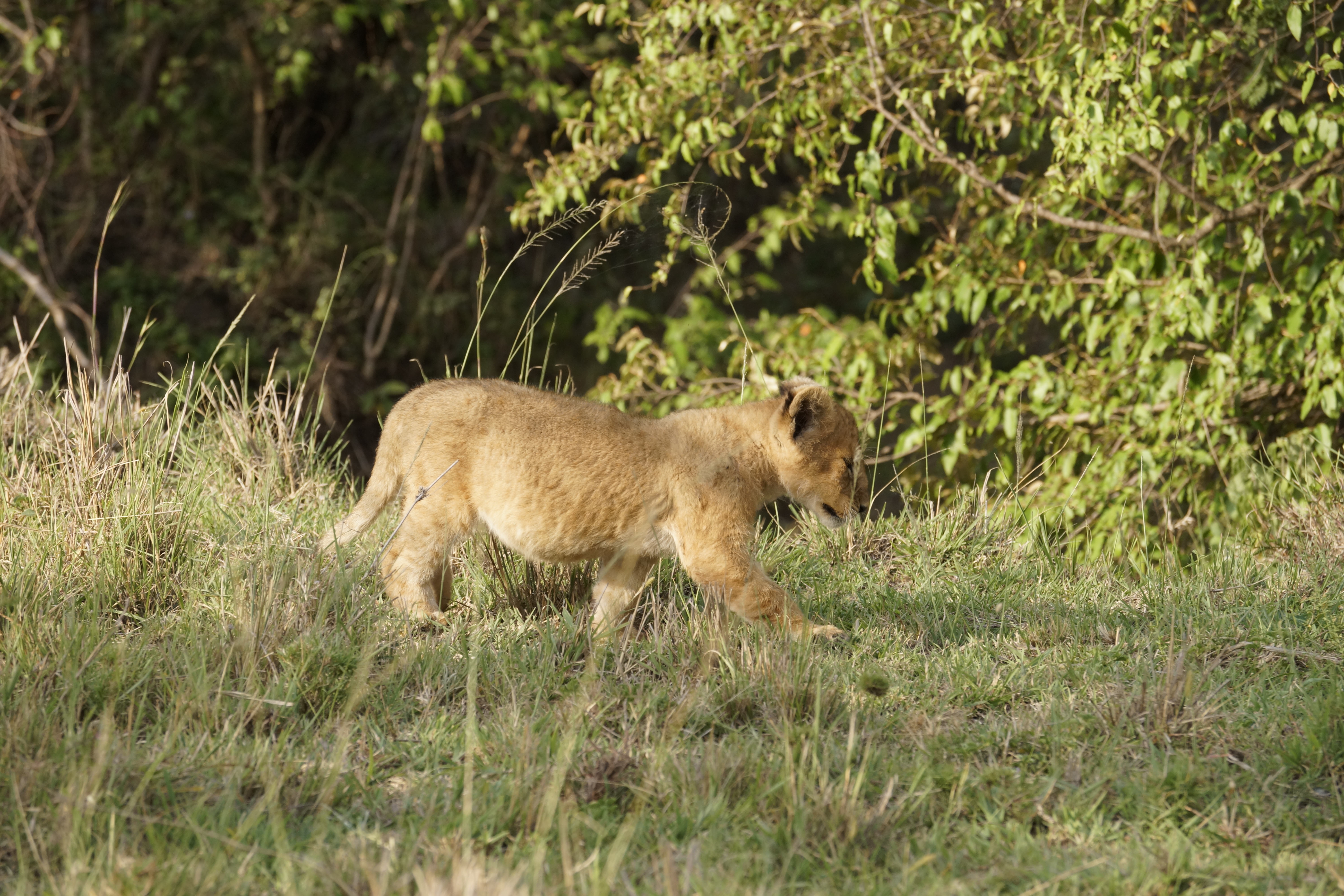 En liten kjøretur unna stopper vi får å se på tre hannløver som nyter siste restene av en gnu. Et dyrs død er en annens brød – sånn er det på savannen. Like bortenfor stopper vi med noen busker og snart kryper det ut en som kanskje blir den neste løvenes konge – en liten løveunge kikker fram og dulter ned til en bekk. Han kommer snart tilbake sammen med en av søsknene sine. Totalt skal det være 4 løveunger som er i dette kullet. Vi ser også en som er litt eldre fra et tidligere kull. Dagen er perfekt!