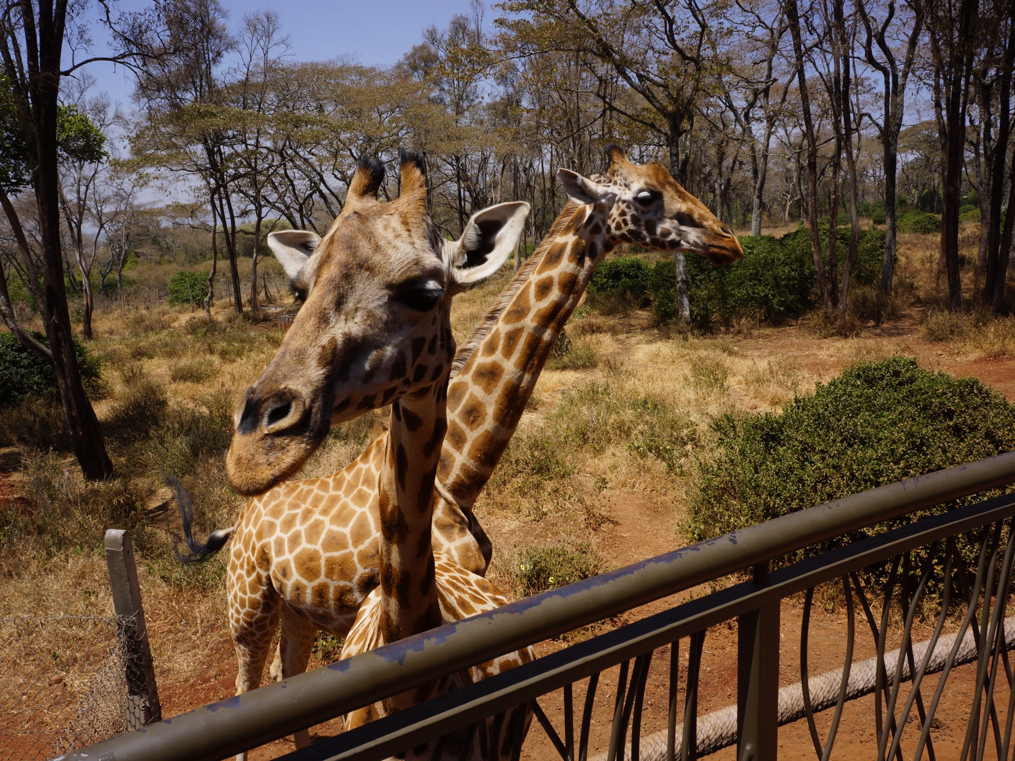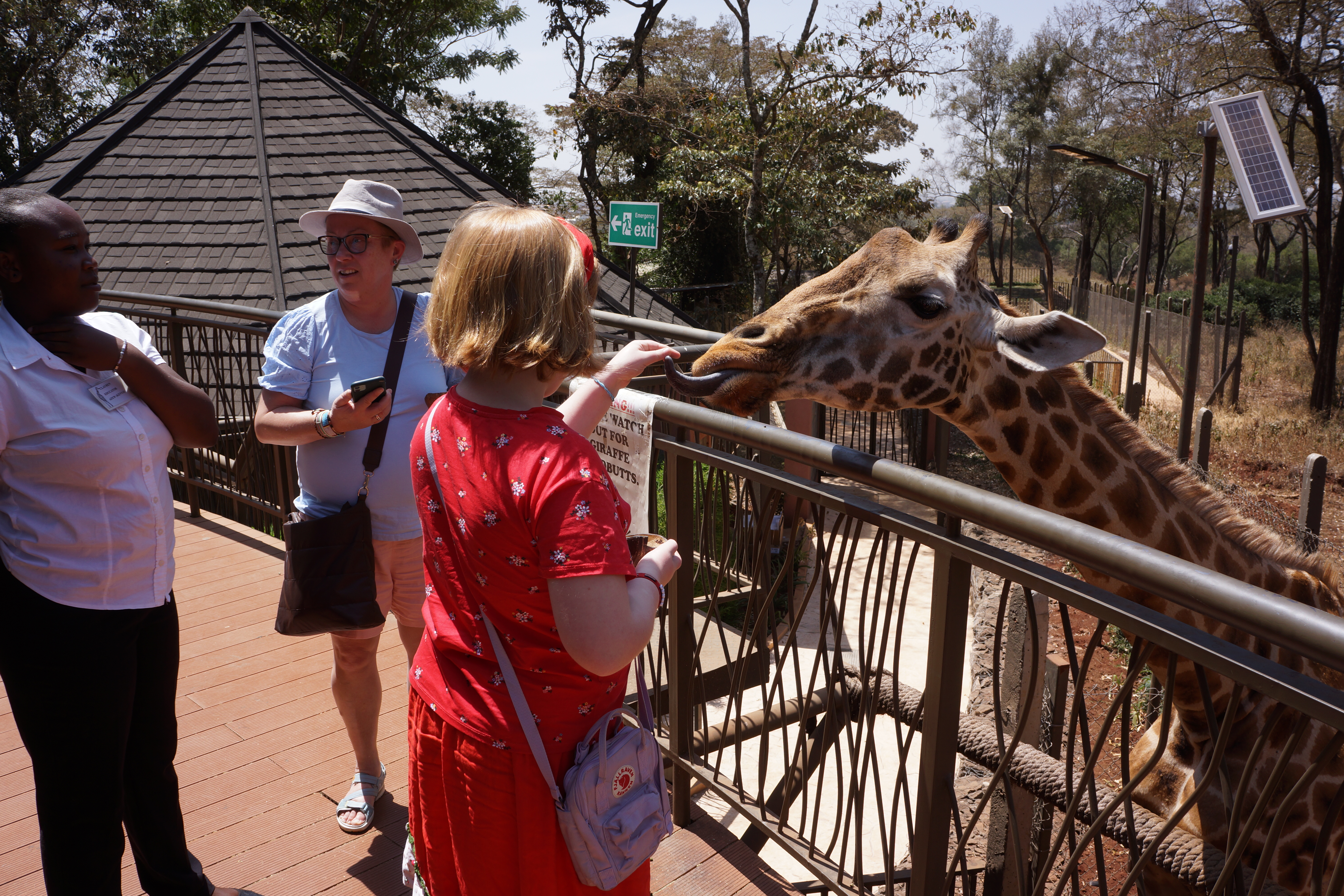 Første stopp er sjiraff-senter. Dette er en liten park der det er Rotchild-sjiraffer. Inne på dette områder ligger også Giraffe Manor, som er et luksushotell. Dette var først boligen til et ektepar, som begynte å ta vare på sjiraffene siden de var utrydningstruet. Nå er det flere sjiraffer inne på området og etterhvert som flere sjiraffer blir store, settes de også ut på savannen.