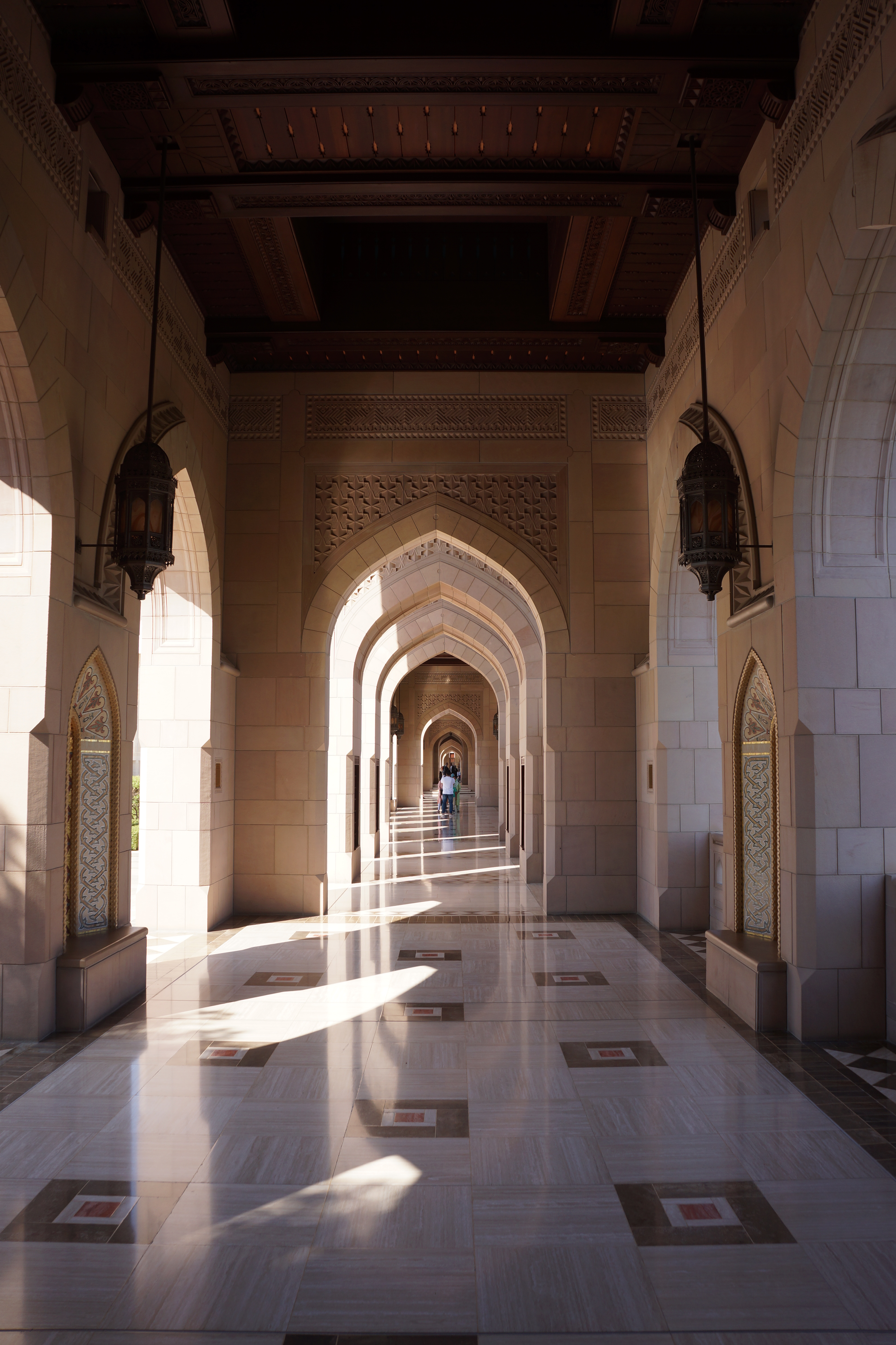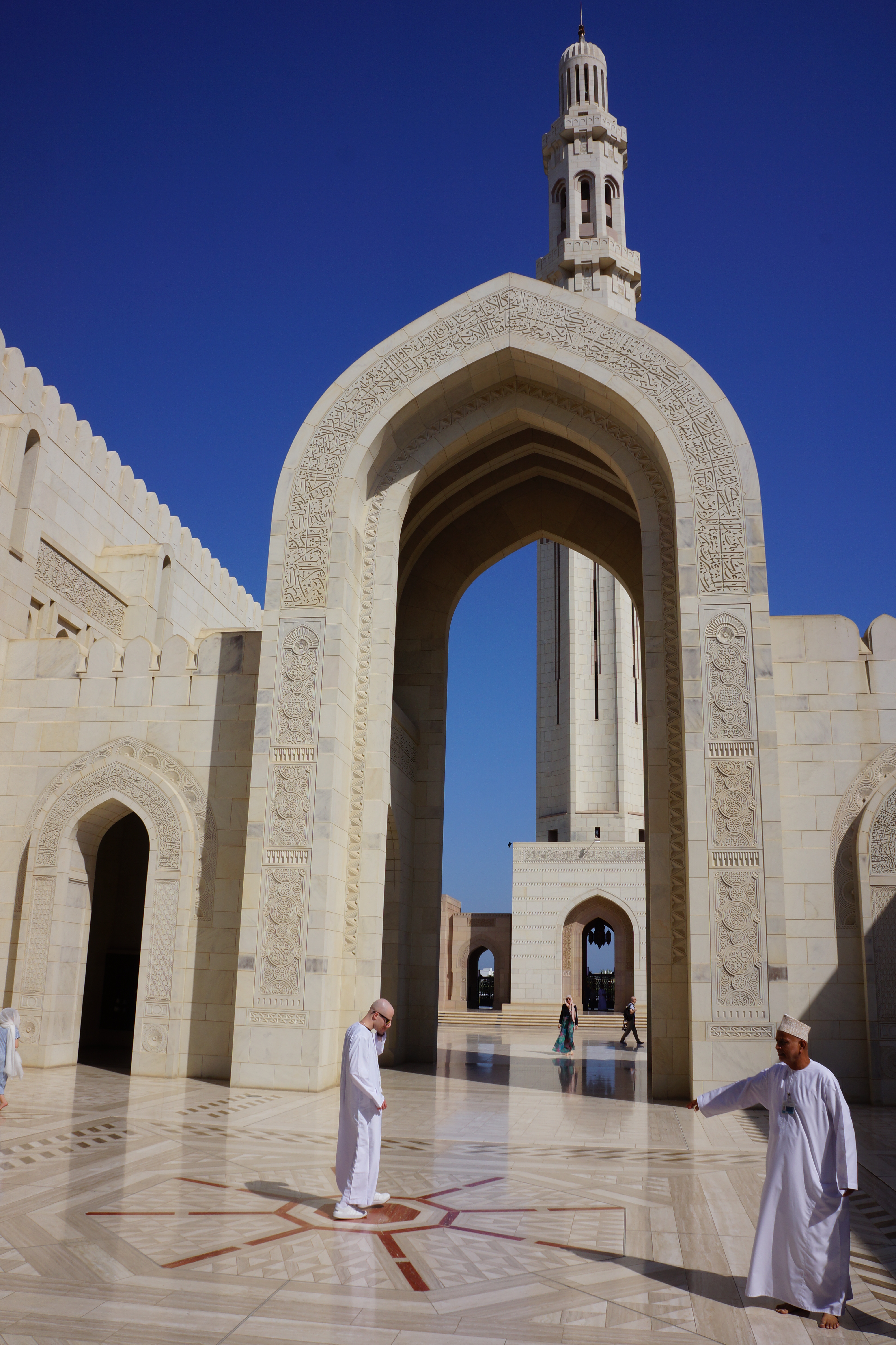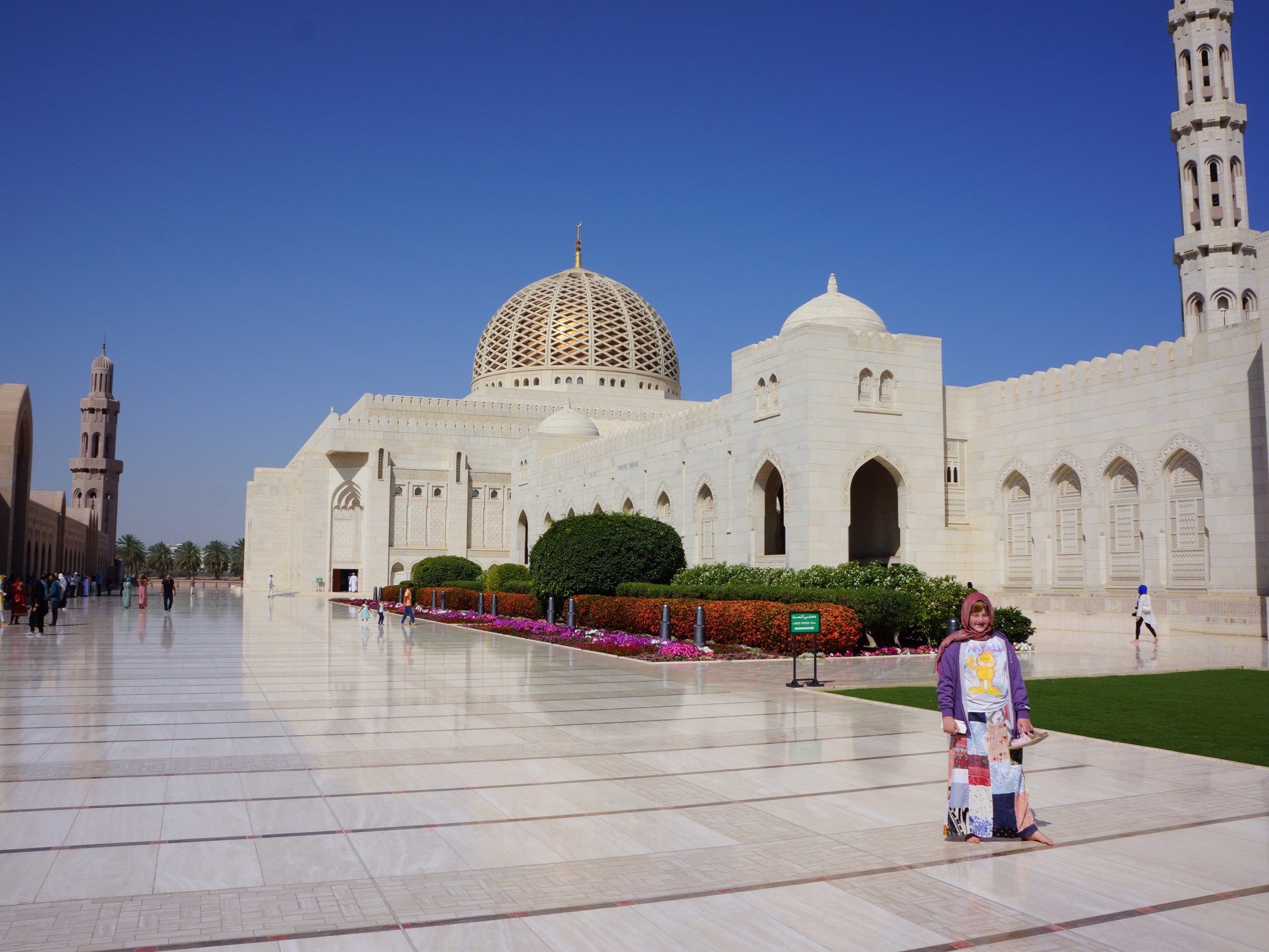I dag morges dro vi til Sultan Qaboos stormoské. Dette er et imponerende bygg, med mye marmor og flott utsmykning. Turister har adgang fram til kl 11, men man må kle seg anstendelig. Det betyr at damer må ha dekke knær, armer og hår, mens menn må ha langbukse, men kan ha t-skjorte. Damer og menn har hver sin hall der de ber, og mennenes hall var kjempestor.