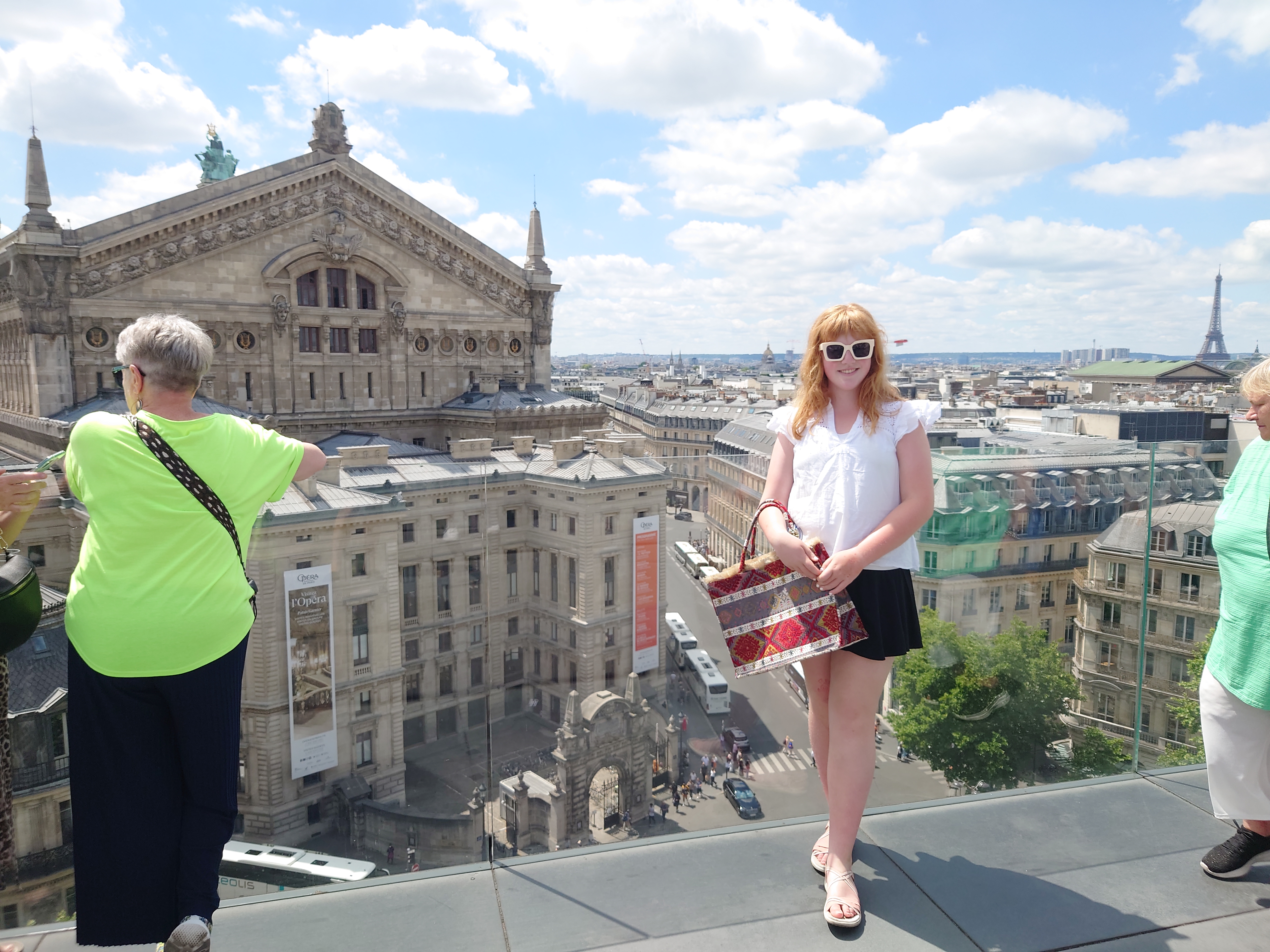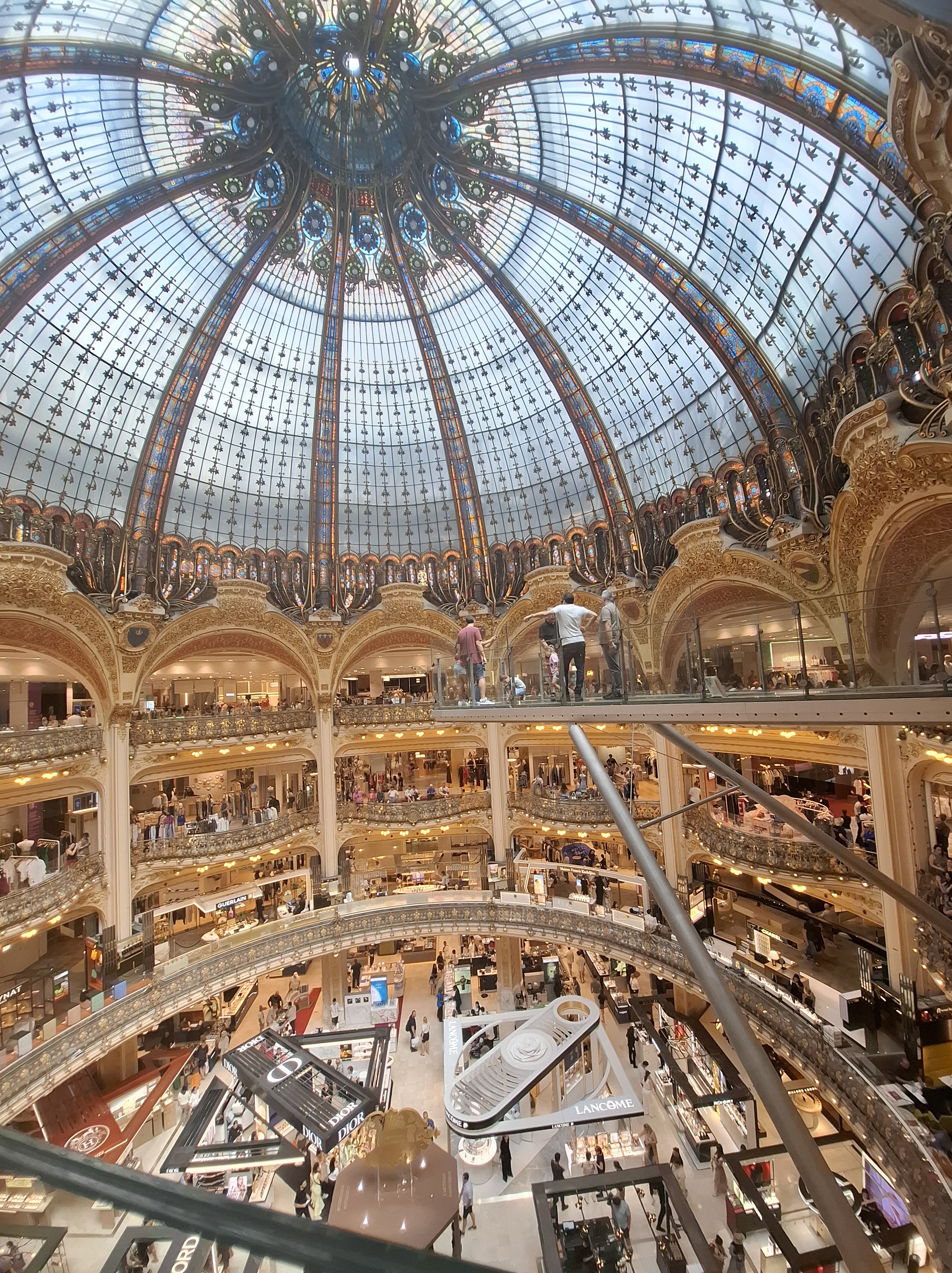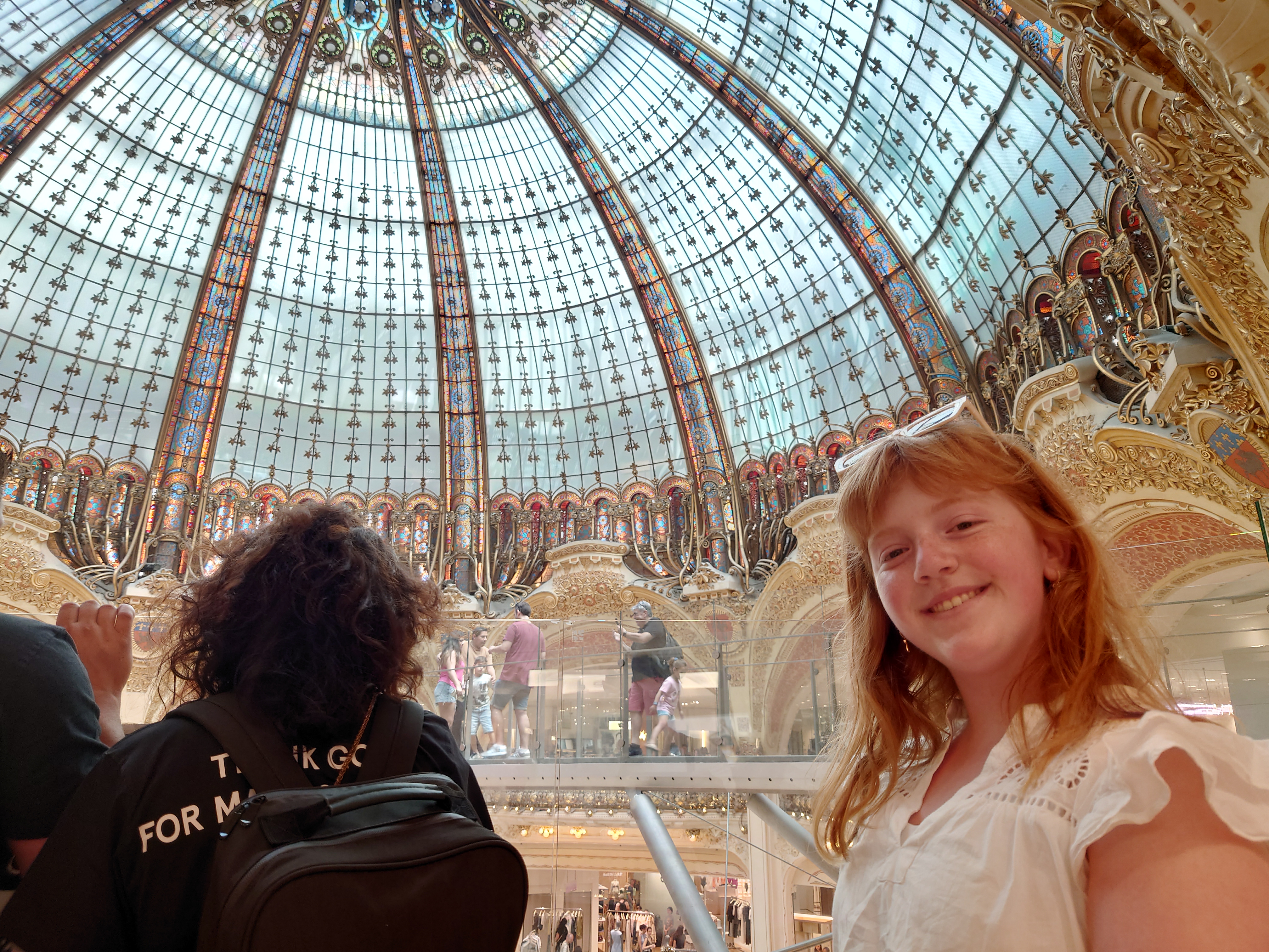 Paris er kjent for shopping, og et av verdens mest kjente kjøpesentre, Galeries Lafayette (Haussmann), måtte besøkes. Dette var veldig flott sammenlignet med hva vi er vant med fra Mandal 🙂 Selv om det var salg i mange av butikkene, var prisene på moteklærne fortsatt høye. Men, når vi kom opp en av rulletrappene møtte vi et skilt der det sto «agnes b.». agnes b. er et motemerke skapt av Agnès Troublé i 1973, og omfatter klær, vesker og annen mote, og gallerier. Det eneste vi hadde råd til var t-skjorter (til €70), og det er utrolig kult med t-skjorter med egen logo 🙂 Etterpå fant vi en herrebutikk og outlet, så det ble både t-skjorte på pappa og to til meg.