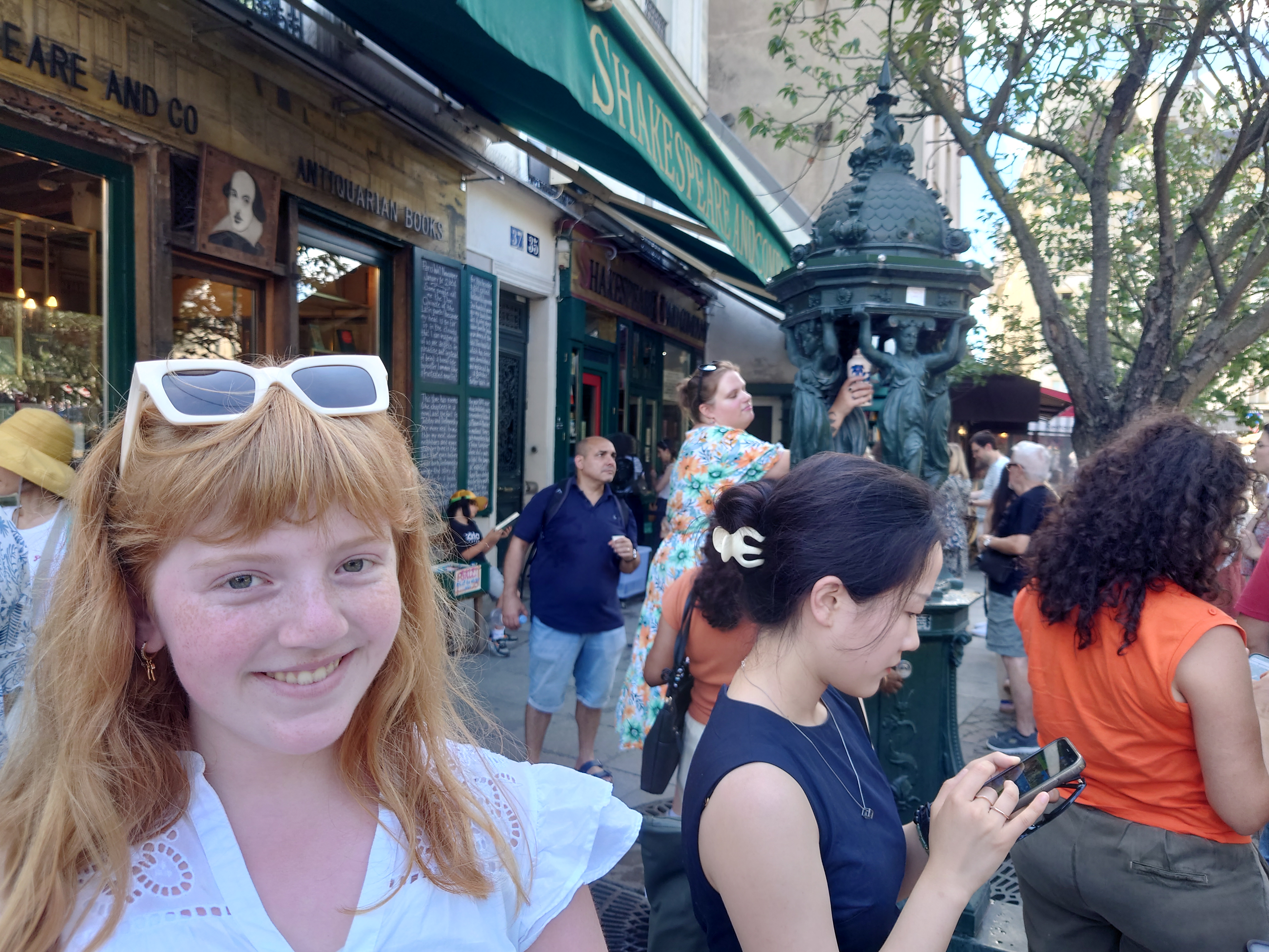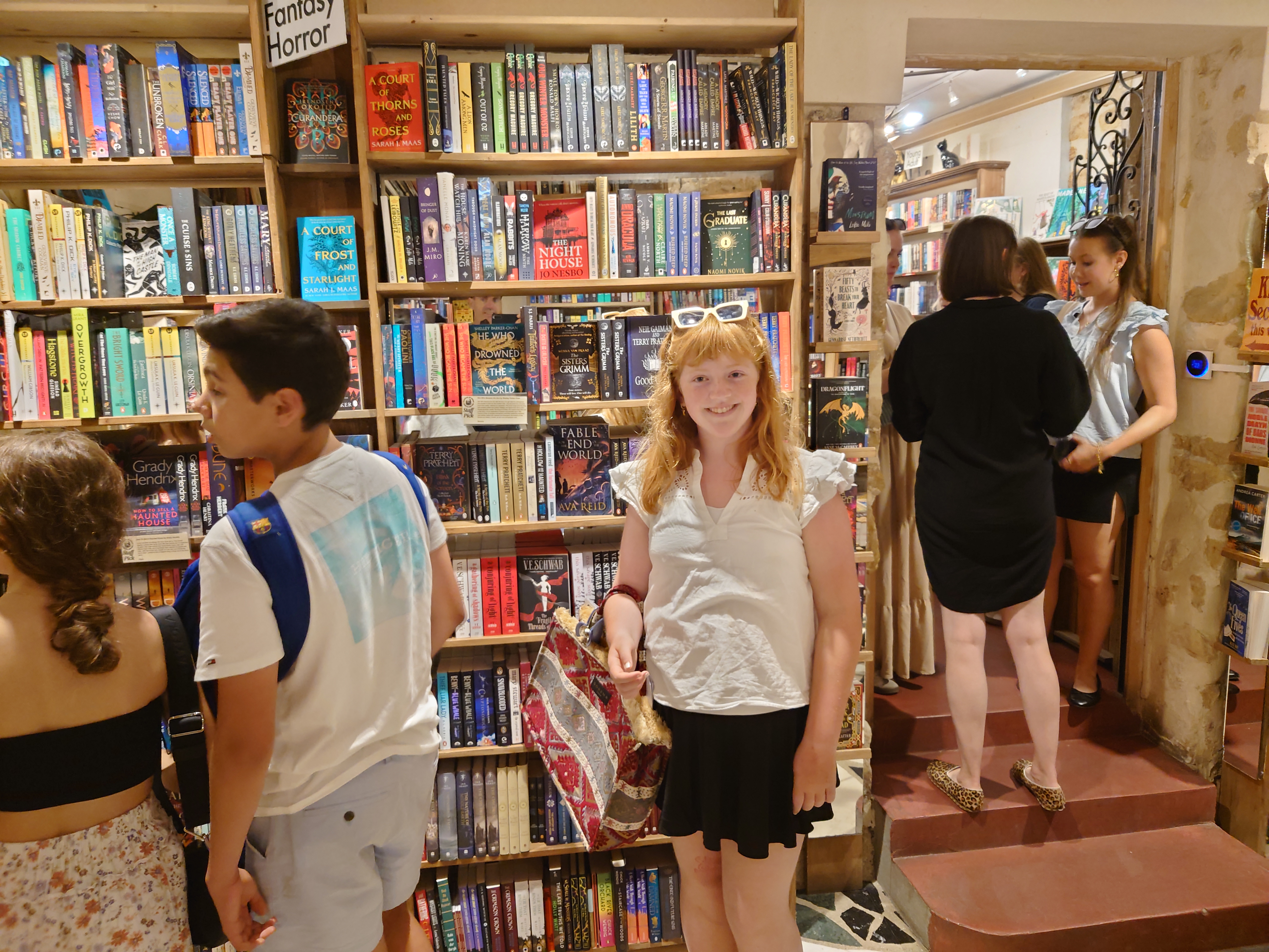 En annet butikk vi måtte besøke var Shakespeare & company. Dette er en kjent bokhandler med engelske bøker. Vi var ikke de eneste som ville besøke butikken, så her måtte vi stå i kø utenfor til de slapp oss inn i små grupper. Det var visstnok ikke lov til å ta bilder inne i butikken, men pappa rakk et bilde før de sa at dette ikke var lov. I tillegg til å selge bøkene, stempler de også disse, så boka jeg kjøpte blir eksklusiv.
