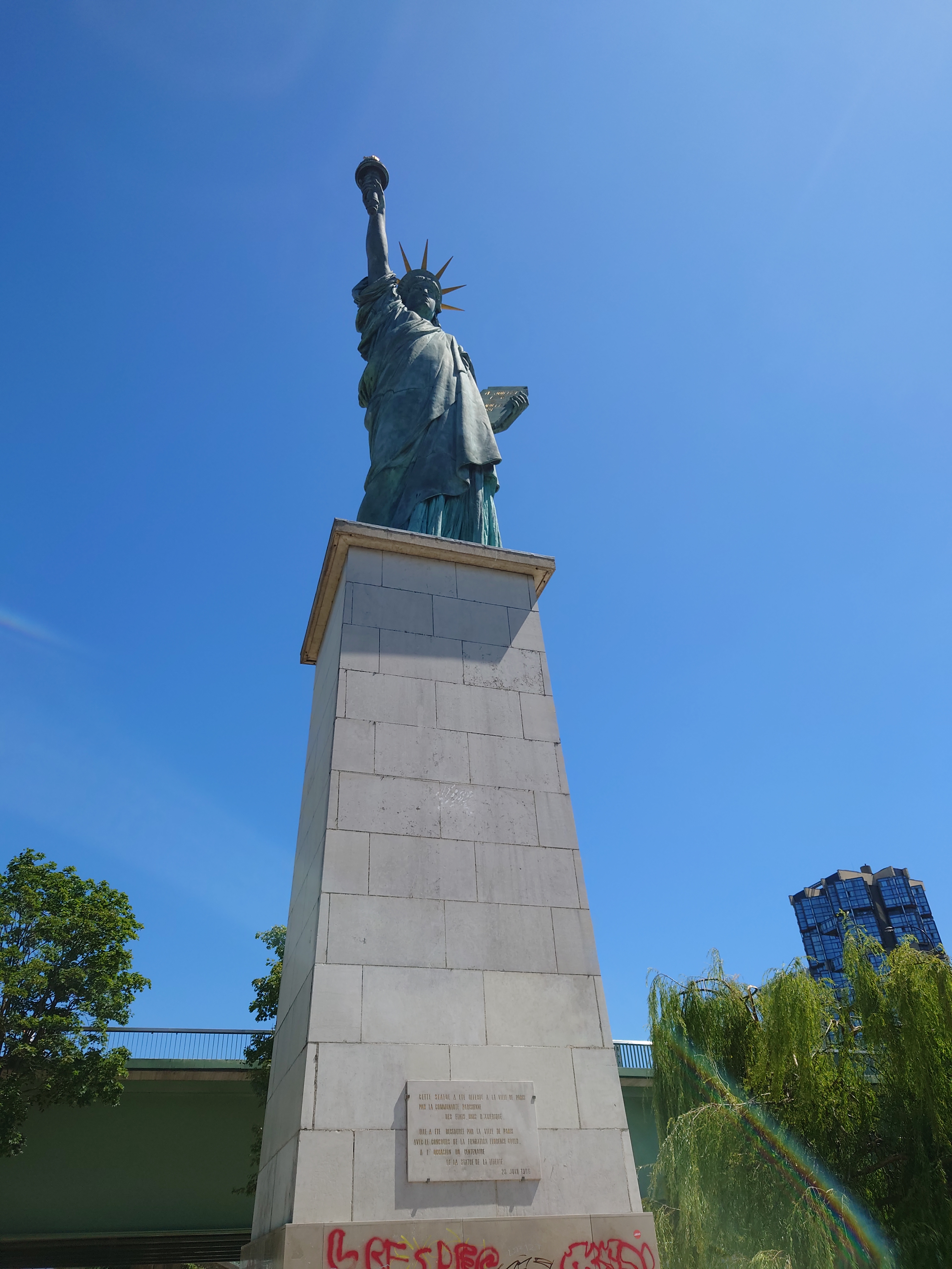 Søndag og siste dag i Paris. Fortsatt veldig varmt, men vi fikk utforsket et par andre steder av byen. Vi fant en frihetsgudinne, som det er flere av, og de er mye mindre enn den i New York. Den i New York er gitt som gave fra Frankrike, så det er en forklaring på hvorfor det er slike også i Paris.
