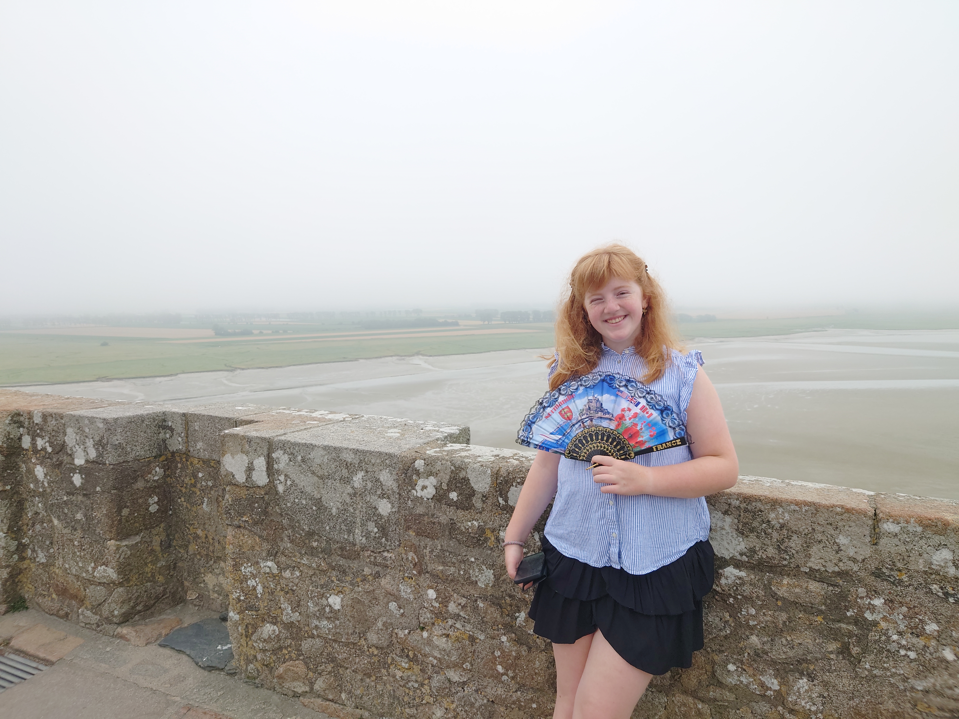Selve byen er bygget i etasjer, med smale gater og koselige butikker. Selvfølgelig mye for turister, men et sted som MÅ besøkes. Når vi kom dagen før var det perfekt vær, men i løpet av natten hadde tåke fra havet kommet inn, så det var ikke like varmt, men toppen av Mont Saint Michel forsvant i de lave skyene.