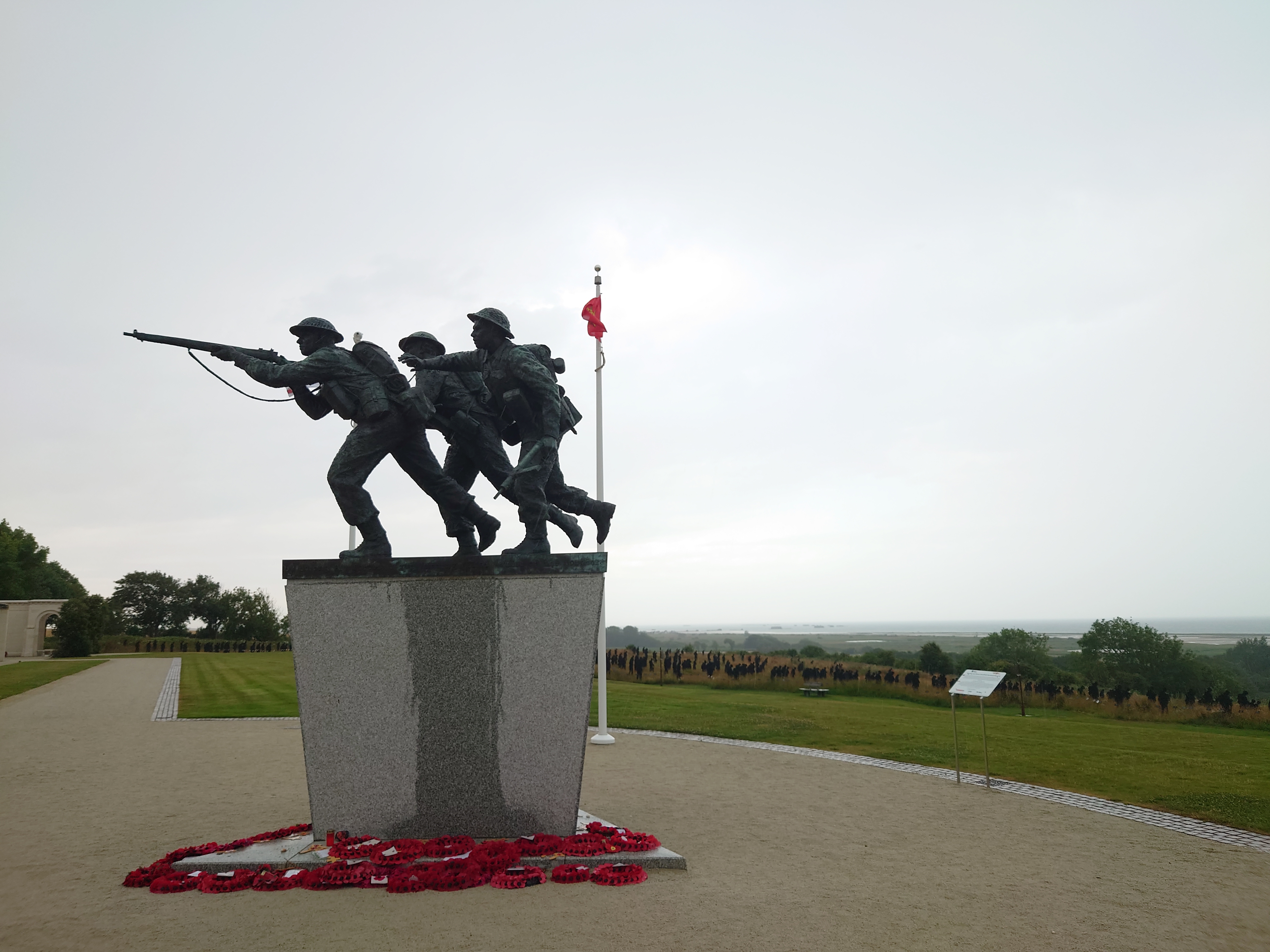 Den britiske kirkegården fra krigen lå på veien dit vi skulle, så selv om det regnet litt, bestemte vi oss for å ta et stopp. Kirkegården og hele området, og besøkssenteret, var stort og det var umulig å bli litt preget av alle som hadde mistet livet under krigen. På den ene siden var det satt opp utskjæringer av soldater, og to sykepleiere, som minne, mens i midten var det søyler med inskripsjoner av navn. Britene mistet 11 000 soldater (54 000 såret/savnet) under D-Dagen. Senteret hadde portretter og historier fra noen som hadde opplevd og overlevd krigen, og det var mange sterke fortellinger. Verden hadde nok vært helt annerledes hvis ikke de allierte hadde lyktes i denne operasjonen.