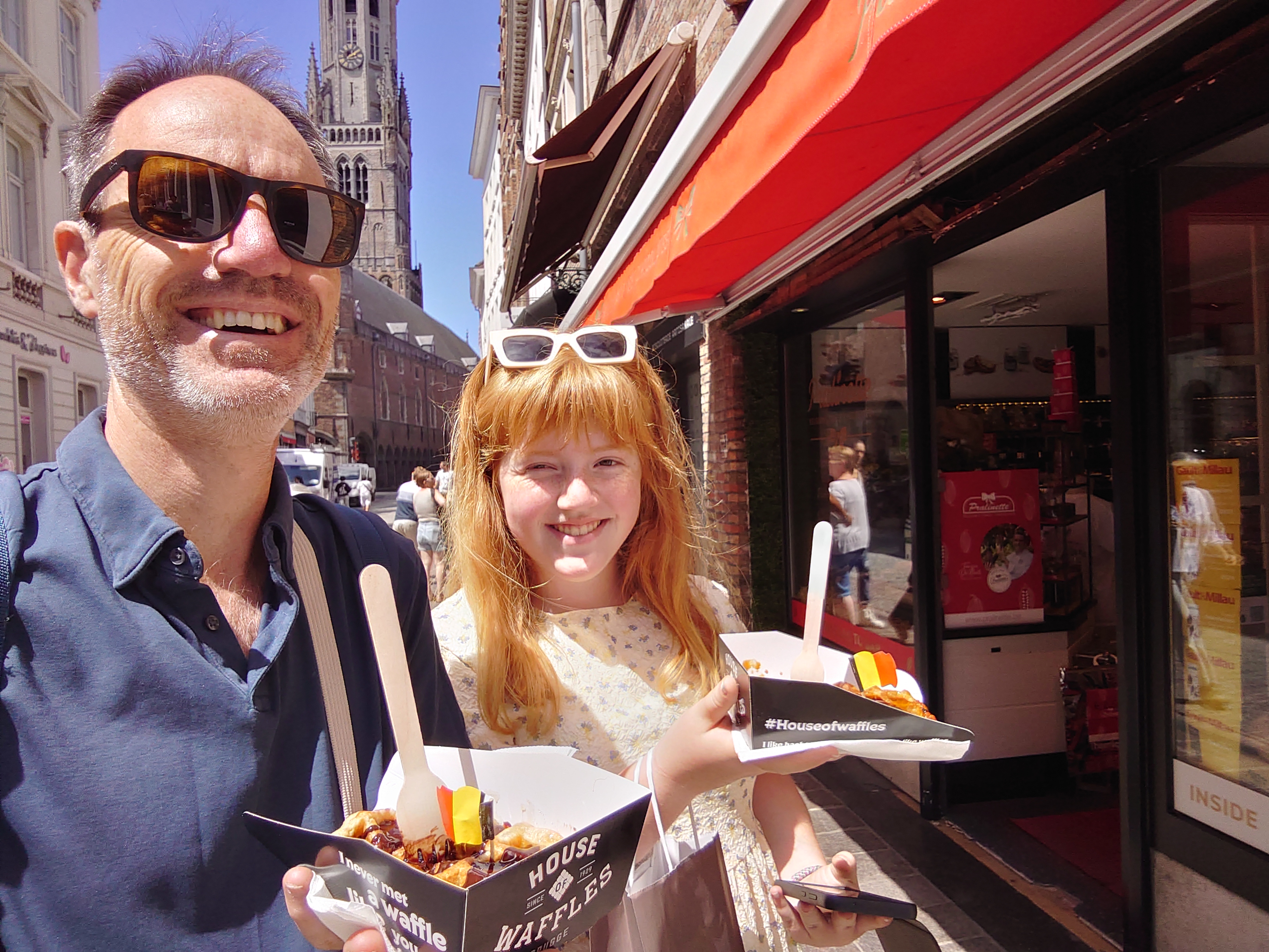 Pappa har vært i Brugge tidligere og ville gjerne vise fram byen når vi var i nærheten. Og dette var en fin by! Selv om det var mange turister, var det mye fint å se på. Brugge er nesten som et mini Amsterdam, med kanaler og fine bygninger. Det eneste som var dumt her var at vi ikke la på parkering mer enn et par timer og holdt på å glemme dette og måtte småspringe til bilen. Men vi rakk det viktigste – belgiske vafler og sjokolade!