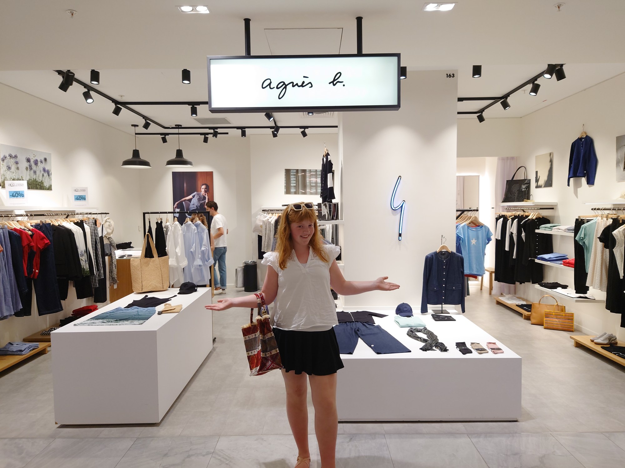 Paris er kjent for shopping, og et av verdens mest kjente kjøpesentre, Galeries Lafayette (Haussmann), måtte besøkes. Dette var veldig flott sammenlignet med hva vi er vant med fra Mandal 🙂 Selv om det var salg i mange av butikkene, var prisene på moteklærne fortsatt høye. Men, når vi kom opp en av rulletrappene møtte vi et skilt der det sto «agnes b.». agnes b. er et motemerke skapt av Agnès Troublé i 1973, og omfatter klær, vesker og annen mote, og gallerier. Det eneste vi hadde råd til var t-skjorter (til €70), og det er utrolig kult med t-skjorter med egen logo 🙂 Etterpå fant vi en herrebutikk og outlet, så det ble både t-skjorte på pappa og to til meg.