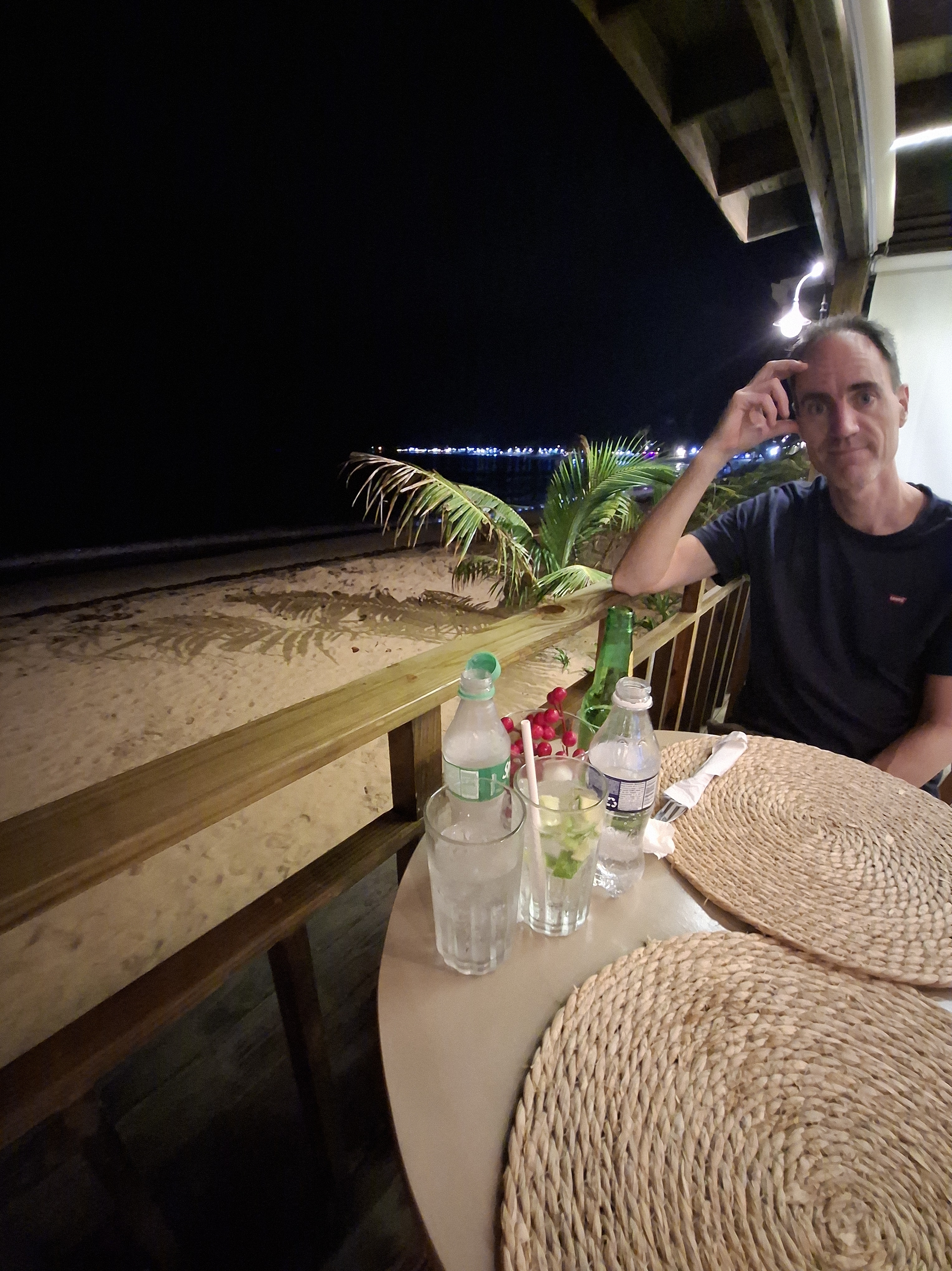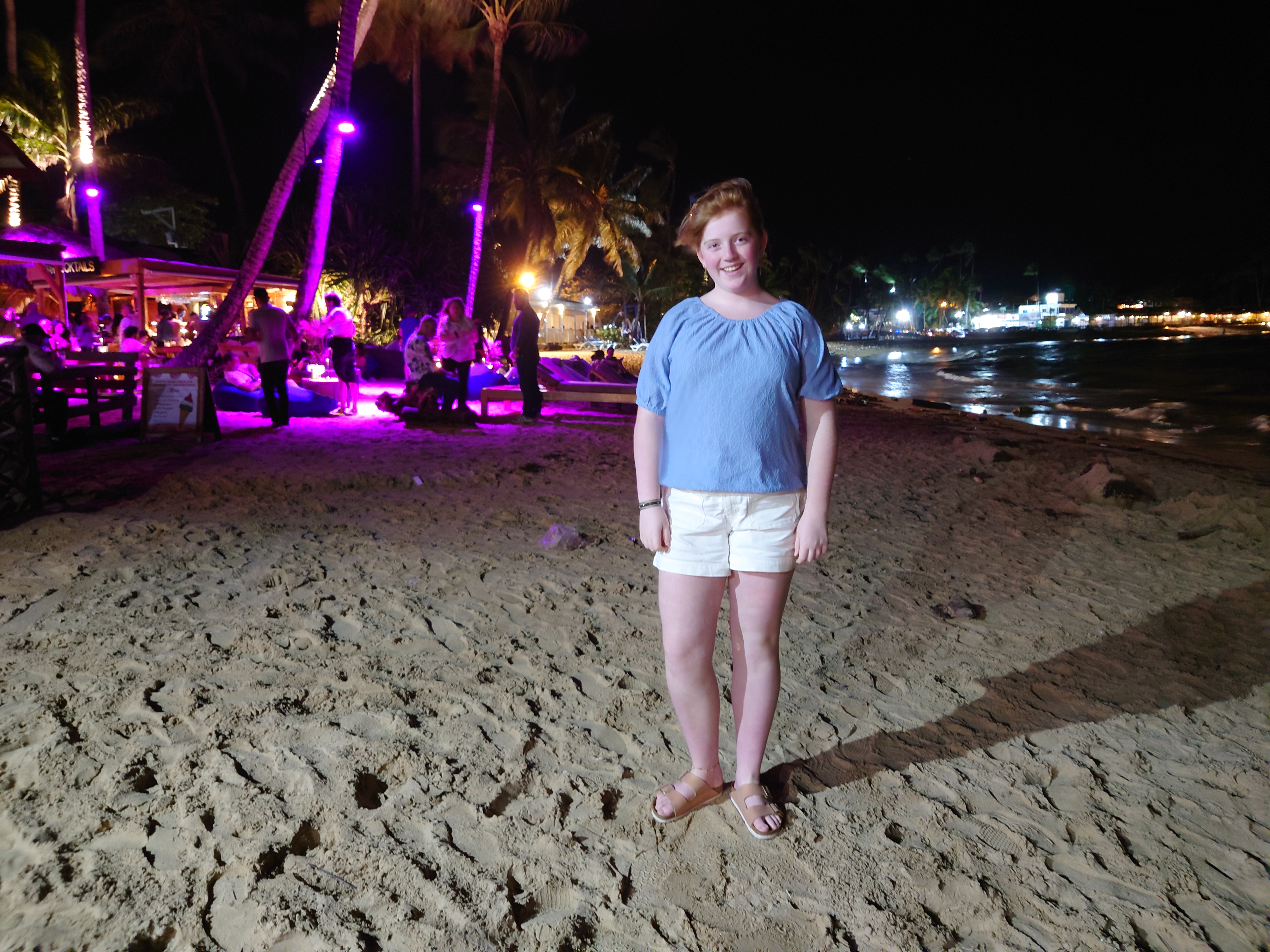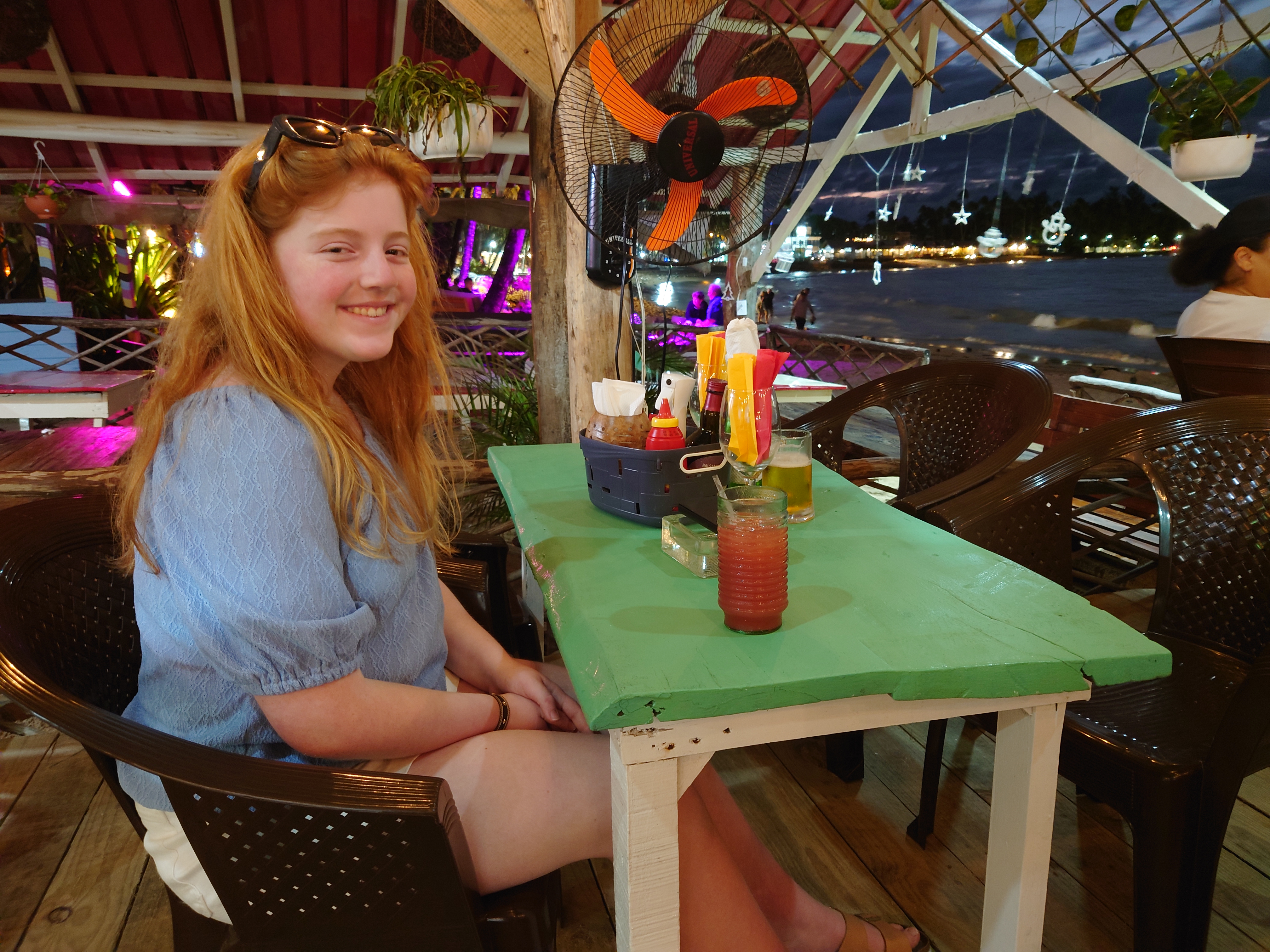På mandag kom endelig dagen da solen skinte for fullt og vi gikk for en dag på den lokale stranden. En liten rusletur bort fra selve byen fant vi en som leide ut solstoler og serverte mat og drikke, så her ble vi stort sett hele dagen. Og gjett om det var to lyserøde skikkelser som fikk nok sol etter hvert. I tillegg var serveringen ikke veldig bra – han måtte spørre 4 ganger hvilken smoothie jeg hadde bestilt og det tok et par timer fra vi bestilte til vi fikk drikke. På kvelden gjorde vi oss klare for å gå ut til middag, og på veien skulle pappa ha seg et par flip-flops. Inne i butikken ble jeg litt dårlig og følte mest for å bare gå tilbake til hotellet for en rolig kveld. Så da ble det take-away pizza. Antagelig som en kombinasjon av ukjent mat og bakterier, for mye sol og lite drikke, så ble jeg kvalm og dårlig neste dag. De neste par dagene fant vi ut at det var best å holde seg rundt hotellet, og la apetitten komme tilbake.